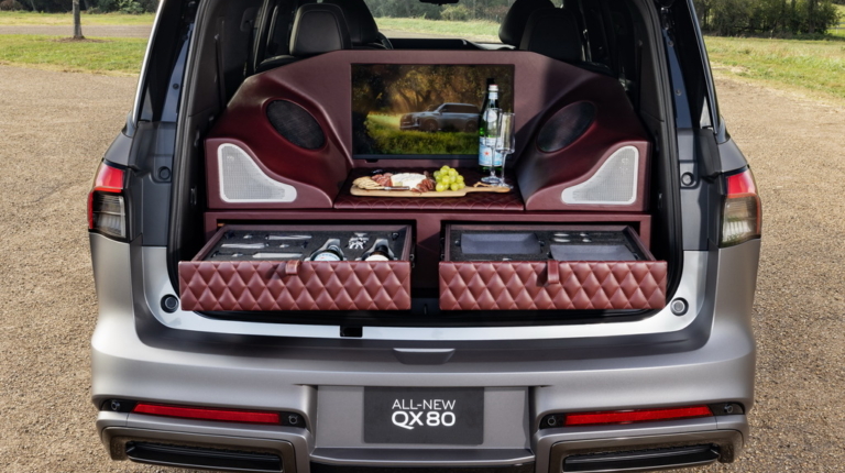 Главным отличием концепта Autograph Lounge от недавно представленного флагманского Infiniti QX80, на базе которого он создан, является богатая комплектация и особый грузовой отсек, в котором разместили телевизор, аудиосистему Klipsch и выдвижные ящики. В ящиках предусмотрены отделения для бутылок с водой и вином, бокалов, тарелок, столового серебра и штопора. Подиум обтянут бордовой кожей и украшен ромбовидной строчкой. Аналогичные материалы используются для отделки всего салона внедорожника.
