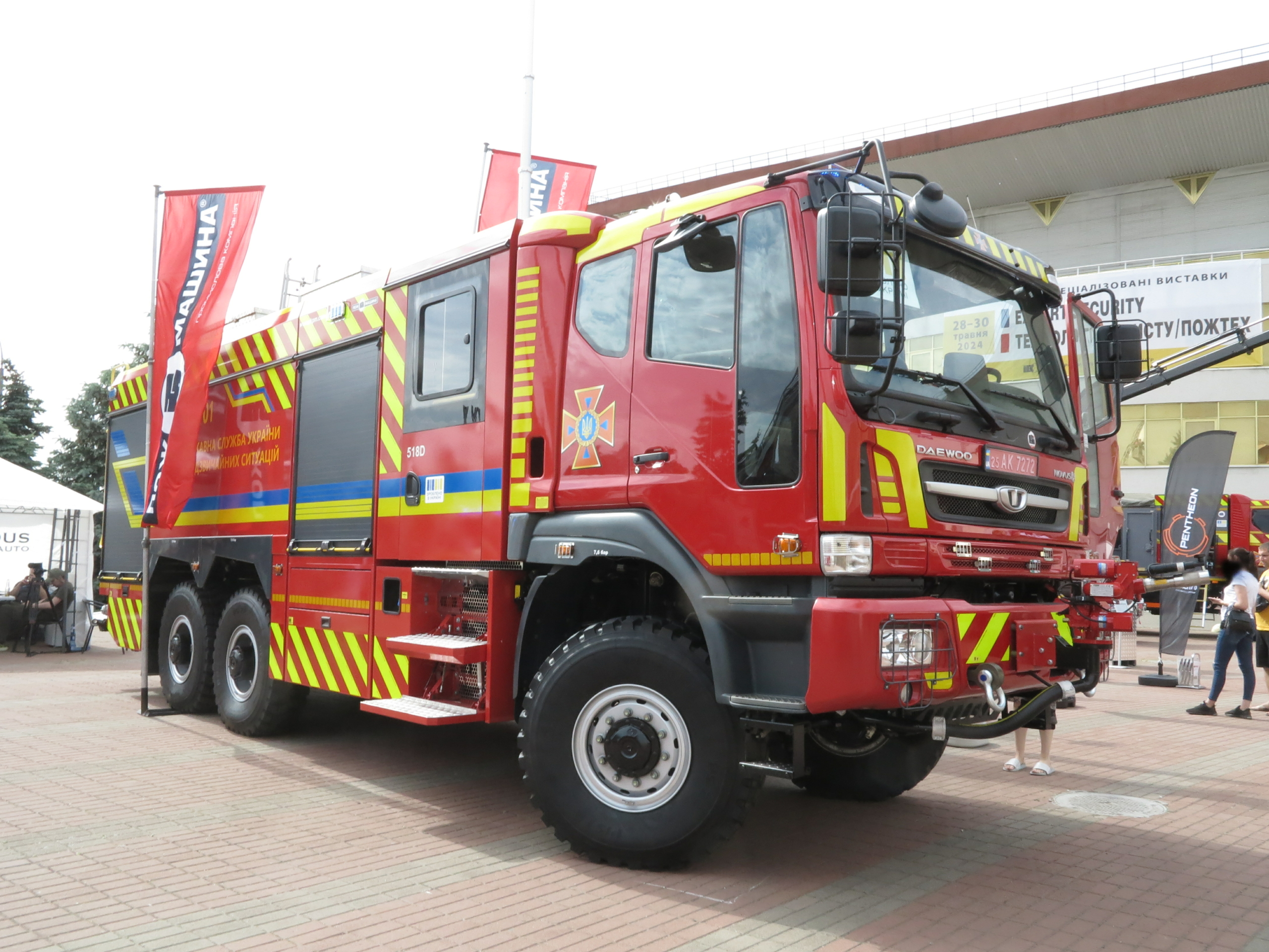 На стенде «Пожмашина» показан и пожарно-спасательный автомобиль с цистерной на шасси Daewoo CM6C7 Novus (6х6). Здесь установлена цистерна для воды на 8000 л и емкость для пенообразователя на 800 л. Насос имеет номинальную подачу 3000 л/мин при давлении 10 бар. Машина полной массой 29 т оснащена турбодизелем Doosan DX12 мощностью 420 л. с.