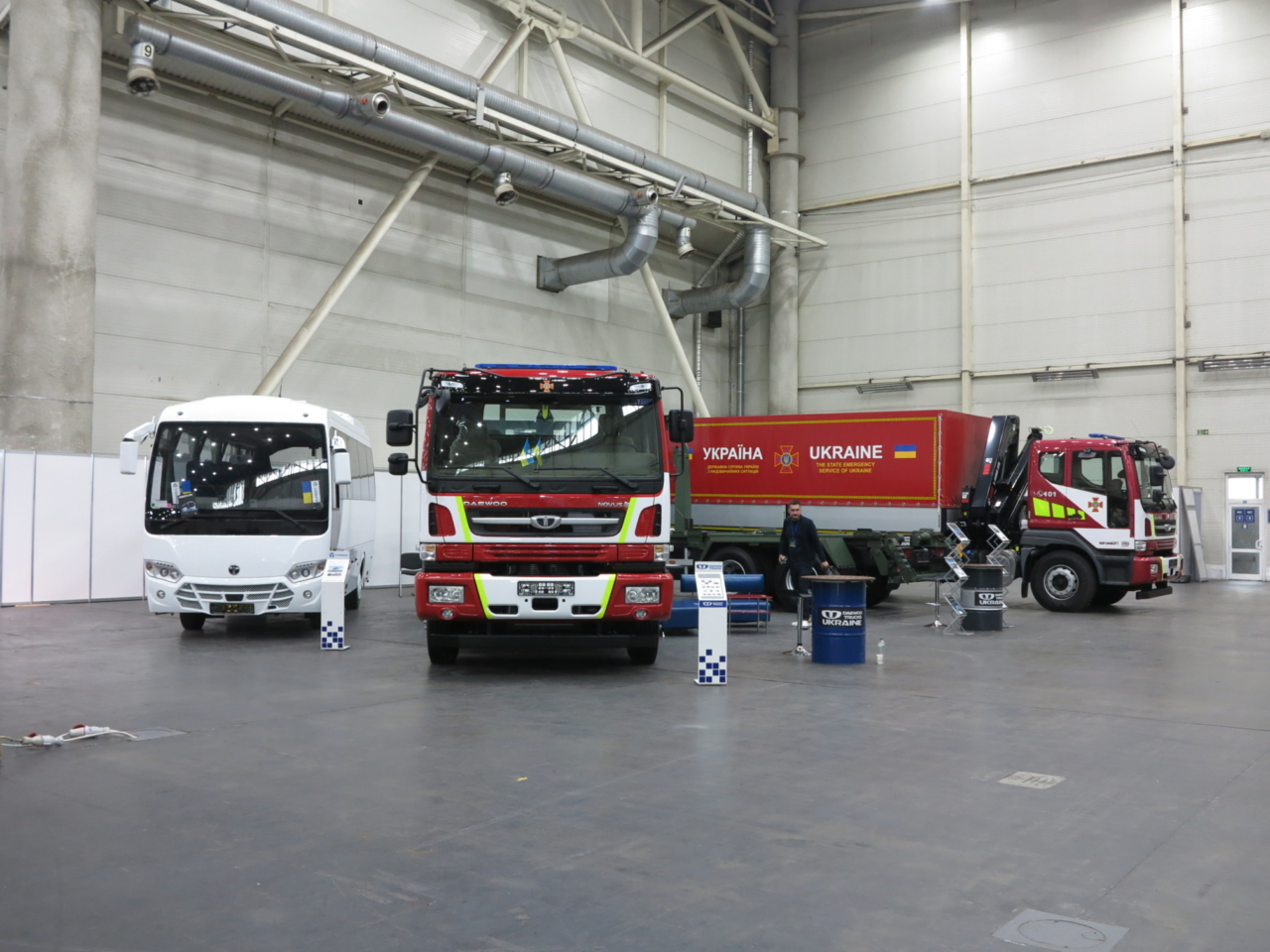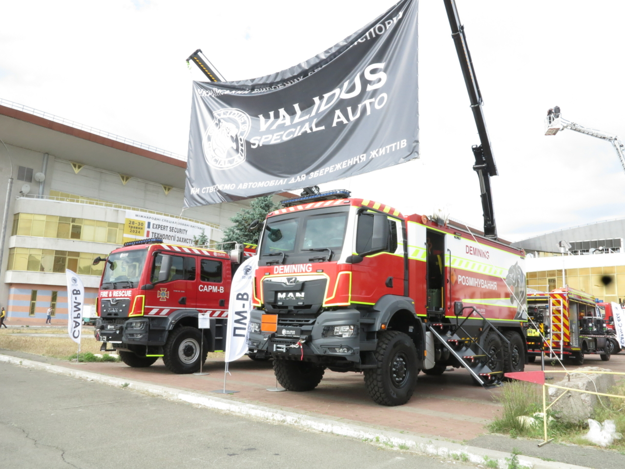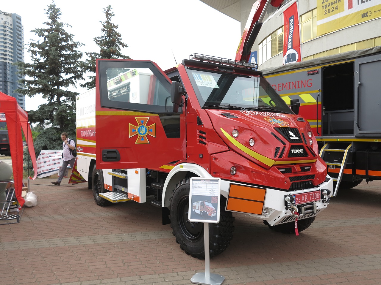 Перед центральным входом развернулась экспозиция сразу двух украинских предприятий, которые занимаются пожарными и аварийно-спасательными автомобиля. Так, на стенде «Пожмашина» можно увидеть новинку – пиротехнический автомобиль легкого типа на базе итальянского вездеходного шасси Tekne Graelion 75 (4х4). Машина полной массой 8,0 т оснащена бронированной кабиной, а также бронированным выдвижным лотком для перевозки взрывоопасных грузовик. Двигатель – IVECO, мощностью 175 л. с.