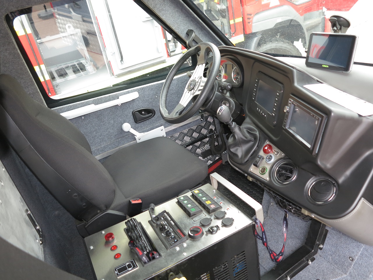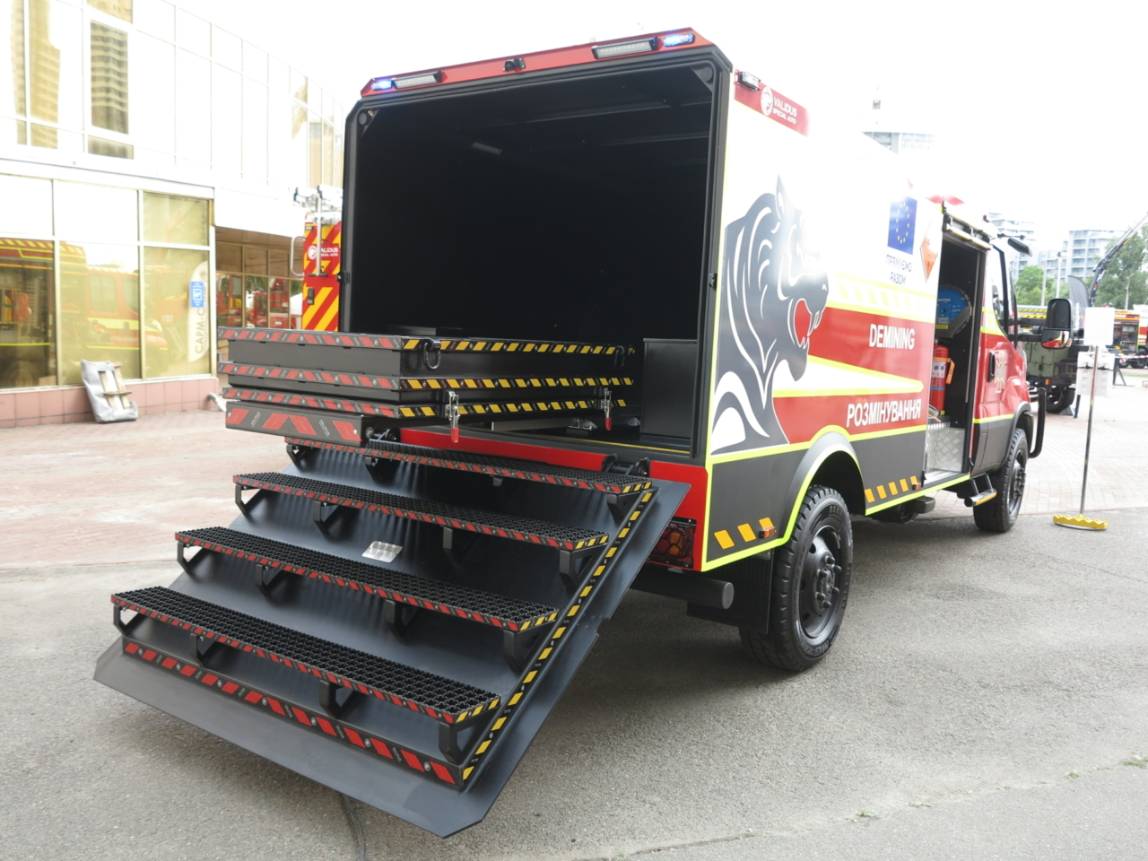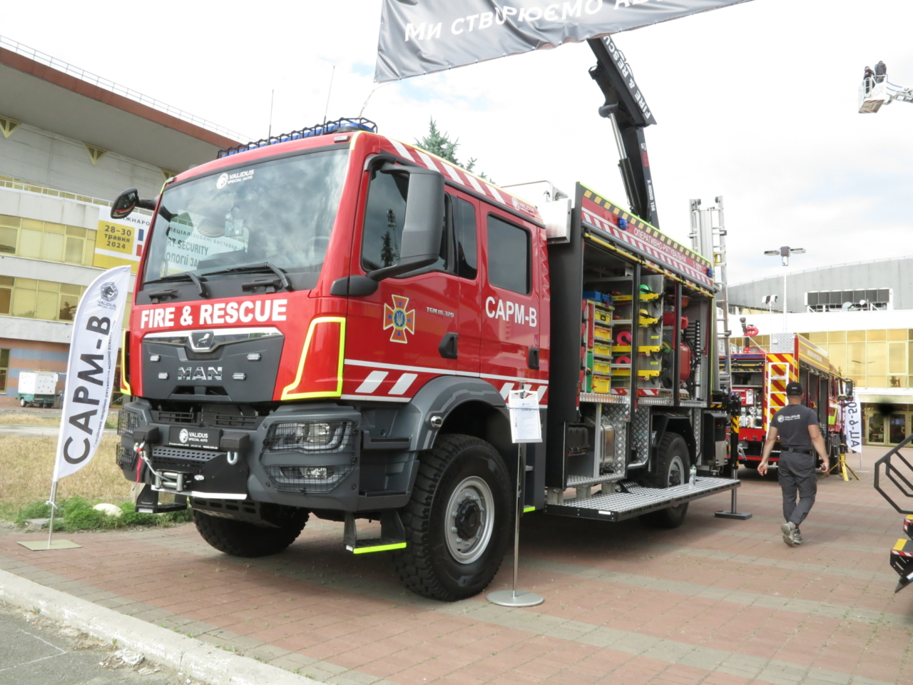 Перед центральным входом развернулась экспозиция сразу двух украинских предприятий, которые занимаются пожарными и аварийно-спасательными автомобиля. Так, на стенде «Пожмашина» можно увидеть новинку – пиротехнический автомобиль легкого типа на базе итальянского вездеходного шасси Tekne Graelion 75 (4х4). Машина полной массой 8,0 т оснащена бронированной кабиной, а также бронированным выдвижным лотком для перевозки взрывоопасных грузовик. Двигатель – IVECO, мощностью 175 л. с.