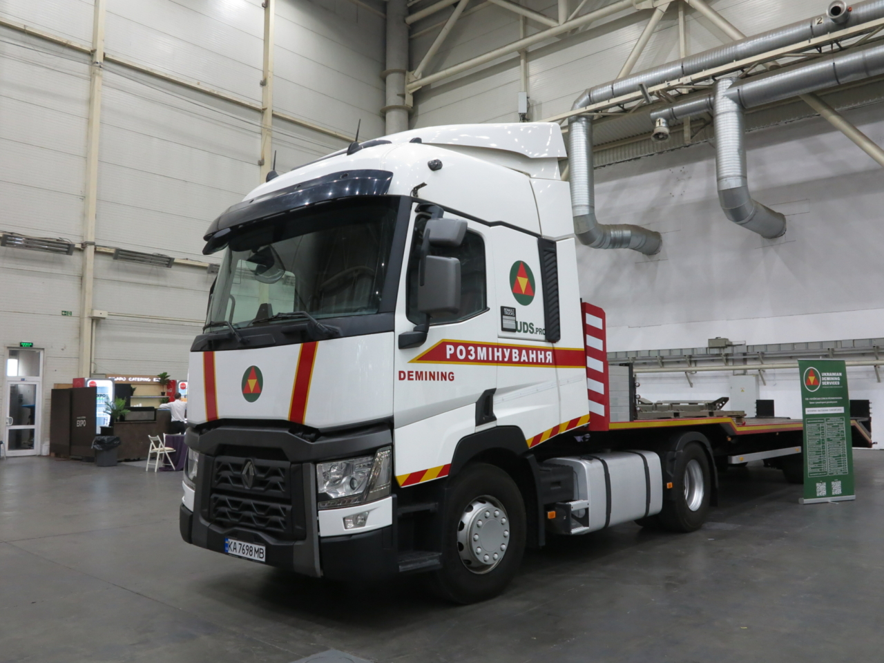 Рядом демонстрируется и пиротехнический автомобиль тяжелого типа ПМ-В на шасси Daewoo Novus (6×6). Автомобиль имеет бронированную кабину с противоминной защитой, а также отсек с бронированным лотком для перевозки взрывоопасных предметов массой до 500 кг.