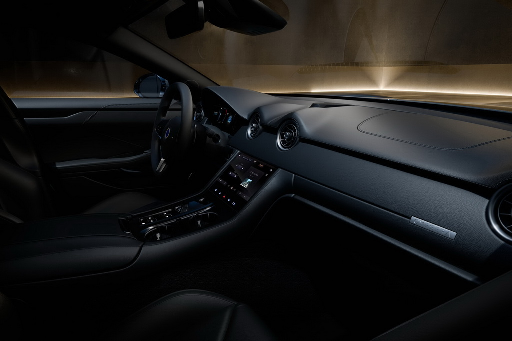 Интерьер Karma Kaveya демонстрирует «текстурные контрасты между глянцевым черным, замшей и кожей, подчеркнутые металлическими элементами, которые переливаются оранжевым и синим, словно обжигаются в печи»
