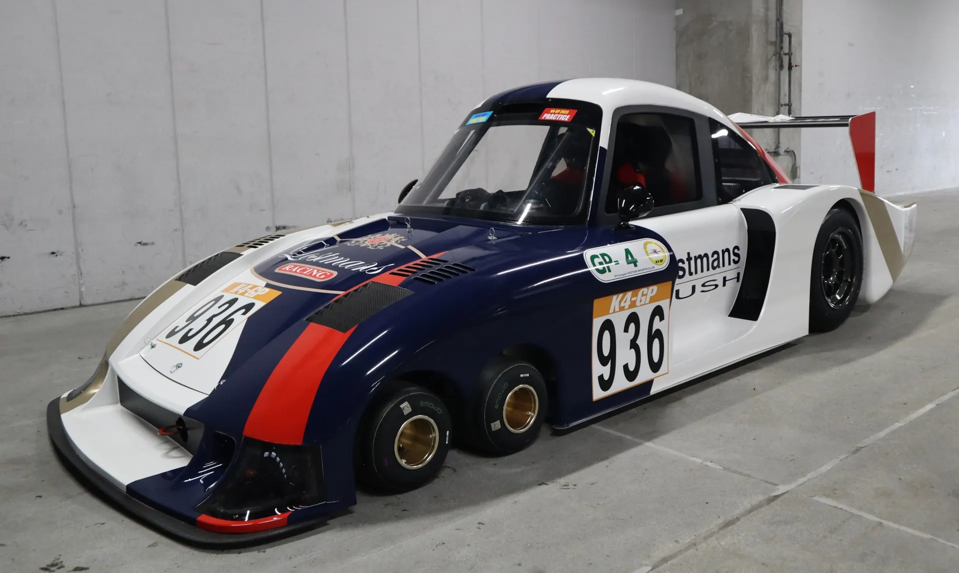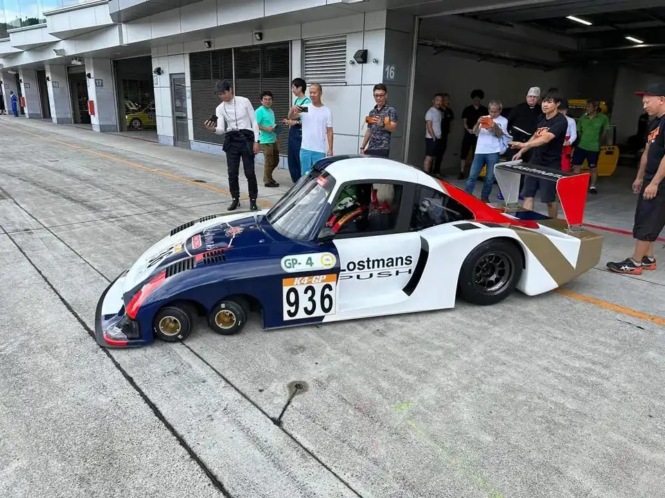 Микс двух легенд — это крошечный трехосный автомобиль, у которого две передние оси с колесами и тормозами от карта. Это решение роднит его с Tyrrell P34. При этом внешне он похож на Porsche 935, но очень компактный. И хотя на финиш он пришел одним из последних, его внешность стоит внимания.