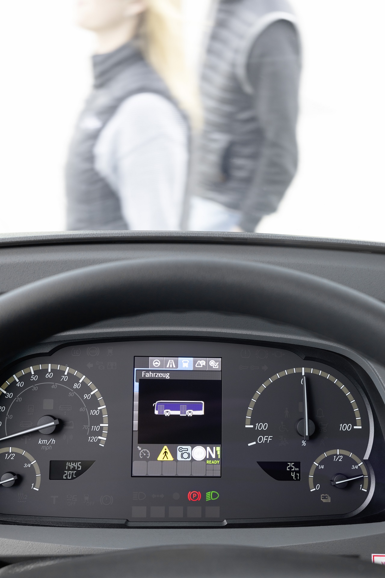 Отметим, что eCitaro cтандартно оснащается передовыми системами помощи водителю. Это и Sideguard Assist 2 на основе радара, и Frontguard Assist, камера заднего вида, а также Traffic Sign Assist – интеллектуальная система, предупреждающая о превышении скорости. Кроме того, в оснащение входят система мониторинга давления в шинах (TPM) и система, следящая за внимательность водителя (Attention Assist) c интерфейсом для установки алкотестера.