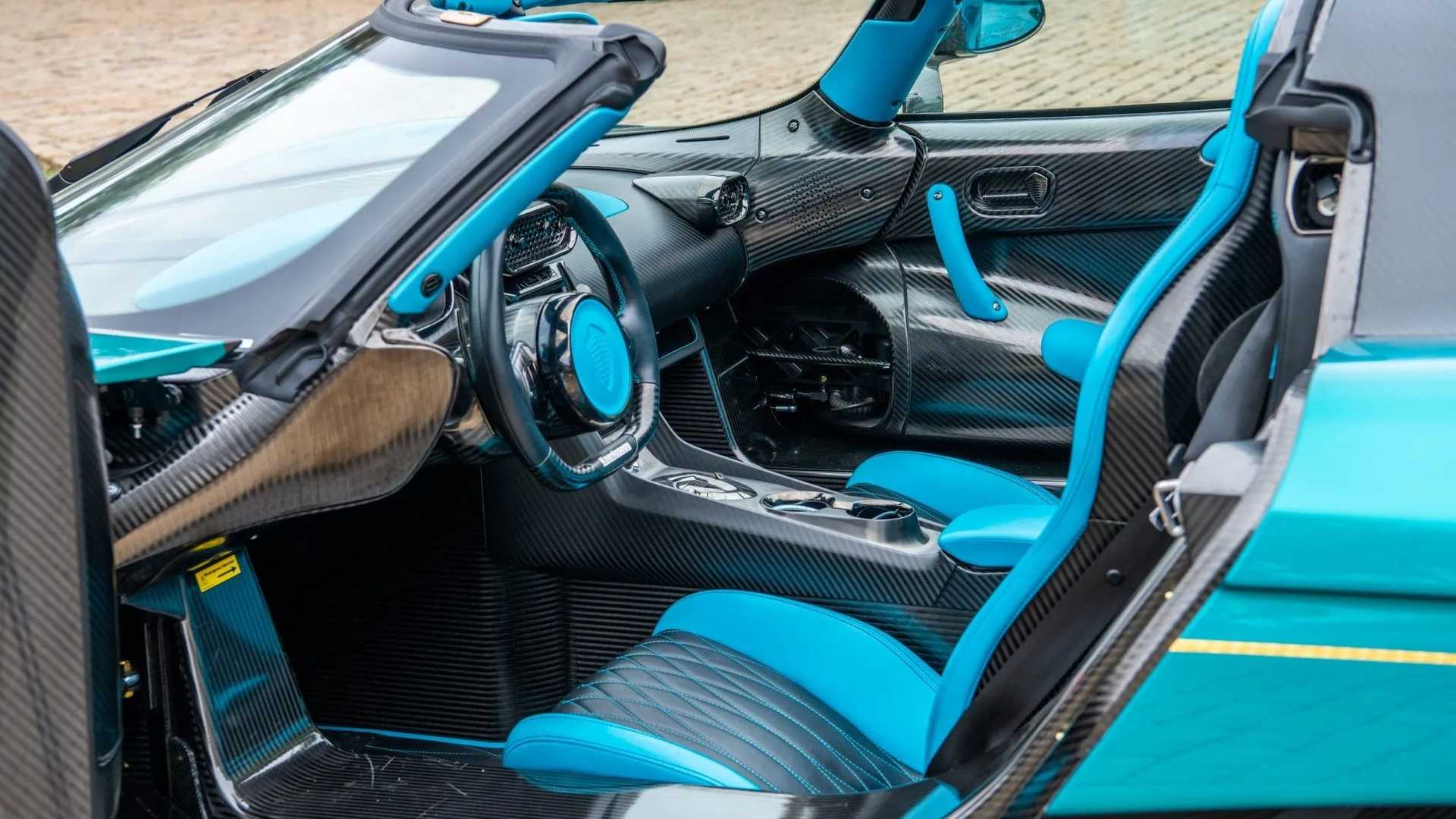 Выставленный на продажу гиперкар окрашен в нестандартный цвет Candy Liquid Blue. Капот, панели крыши и крышка двигателя — из покрытого прозрачным лаком «голого» карбона с вкраплениями сусального золота.