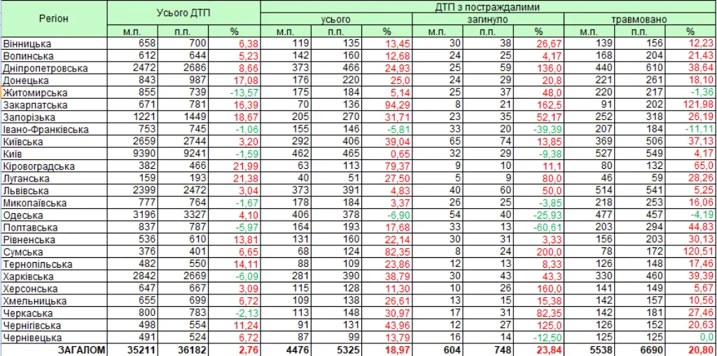Рекордсменом по сокращению летальных исходов в авариях стала Полтавская область. За отчетный период она снизилась на 60,61% (13 человек). Также высокий результат по снижению показателей показала Ивано-Франковская область, где смертность в ДТП уменьшилась на 39,39% (20 человек).