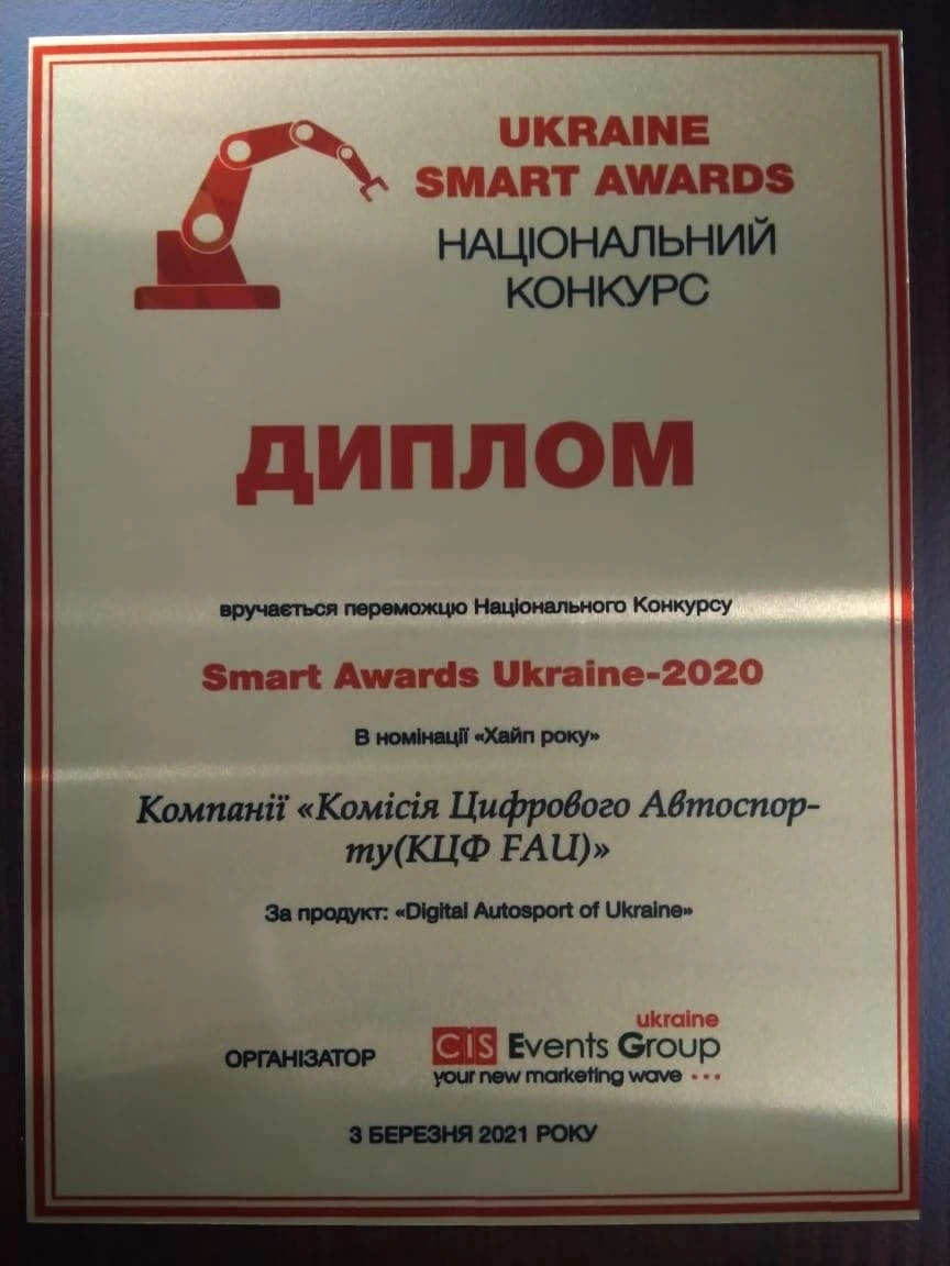 На днях состоялась церемония награждения победителей конкурса Ukraine Smart Awards! Поздравляем Комиссию Цифрового Автоспорта КЦА FAU с победой в номинации "Хайп года" за продукт Digital Autosport of Ukraine - проведение официальных чемпионатов Украины по цифровому автоспорту. Напомним, весной 2020 Автомобильной Федерацией Украины была создана Комиссия Цифрового Автоспорта КЦА FAU. Поэтому все национальные соревнования по цифровому автоспорту официально проходят под эгидой FAU - Автомобильной Федерации Украины, а международные соревнования - под эгидой FIA. Чемпионы виртуального автоспорта награждаются на Ежегодной Церемонии Награждения FAU. И в 2020 году впервые в истории Украины были проведены официальные Чемпионаты по цифровому автоспорту. Продолжаются соревнования в цифровом формате и в этом году - именно сейчас в разгаре Чемпионат Украины по цифровым кольцевым гонкам. Узнать последние новости и посмотреть трансляции можно на сайте «Автоцентр» в разделе Автоспорт. А полную информацию об участии в гонках вы всегда найдете на официальном Discord канале. Первый Автомобильный и Автоцентр - генеральные медиа-партнеры Чемпионата Украины по цифровым кольцевым гонкам.
