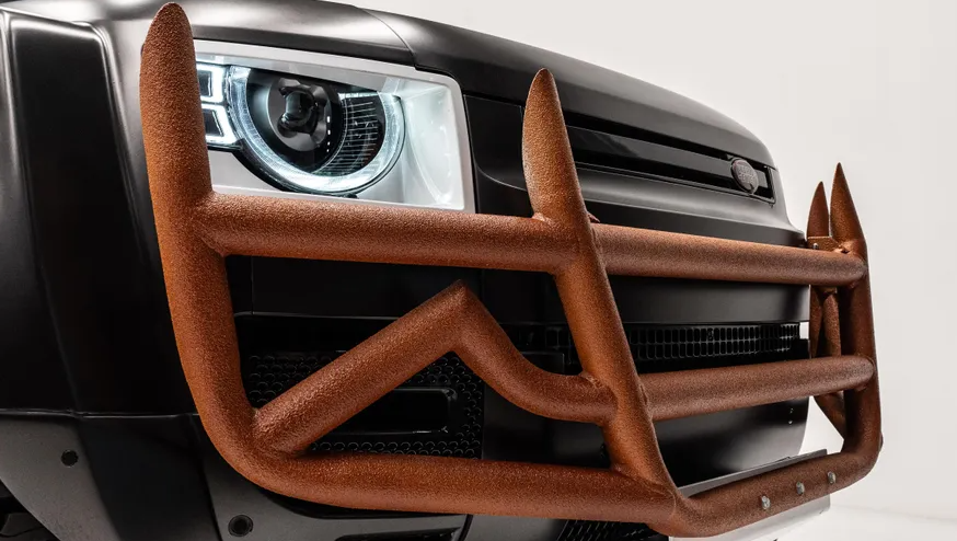 Тюнеры взяли за основу не стандартный внедорожник, а ранее модернизированный своими коллегами. Его дополнили новыми элементами, тем самым добавив модели брутальности. Итак, этот Defender получил от специалистов Apocalypse Manufacturing защитный «намордник» на передней части, светодиодную балку на крыше, массивный багажник и каркас безопасности в грузовом отсеке. Надстройки окрашены в контрастный оттенок, напоминающий ржавчину.
