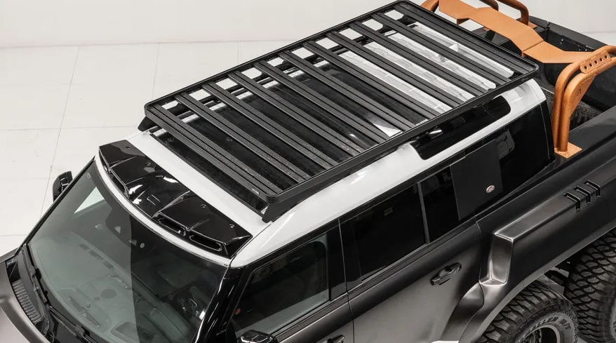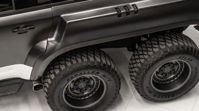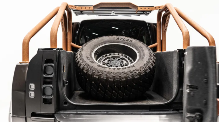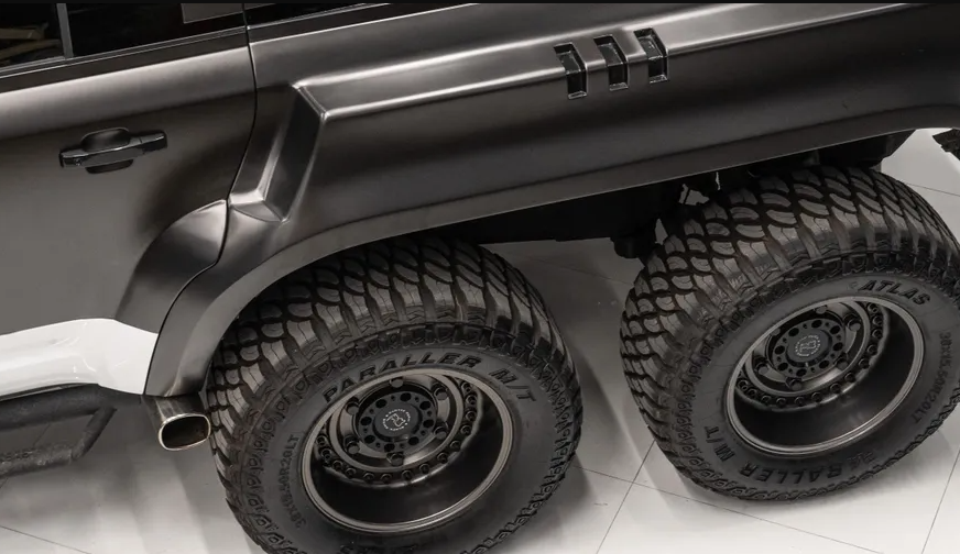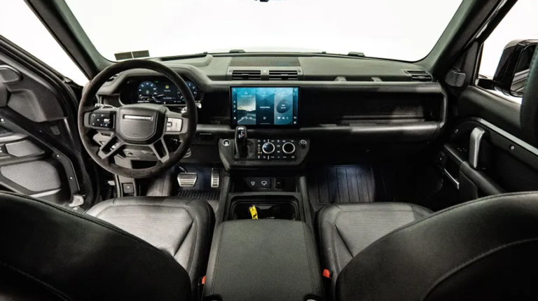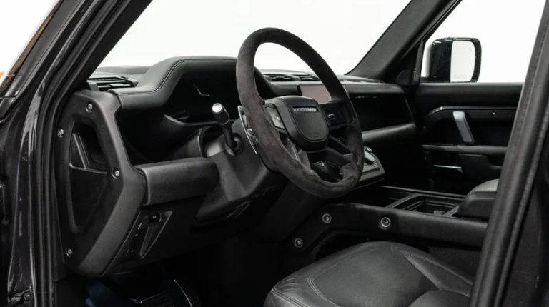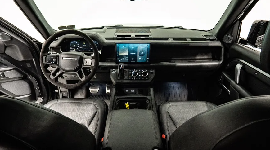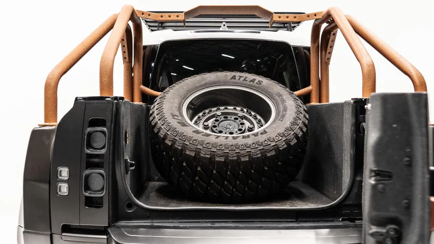 Внедорожник получил независимую пневмоподвеску, за счет которой дорожный просвет можно увеличивать на 200 мм. Также у него усилен подрамник и расширенные арки, что делает этот Defender на 50 мм шире. А завершают образ 20-дюймовые литые диски военного образца, обутые в «зубастые» 38-дюймовые шины.