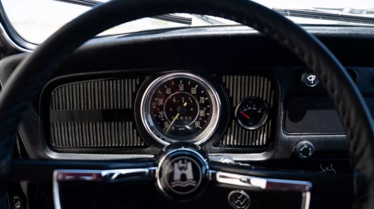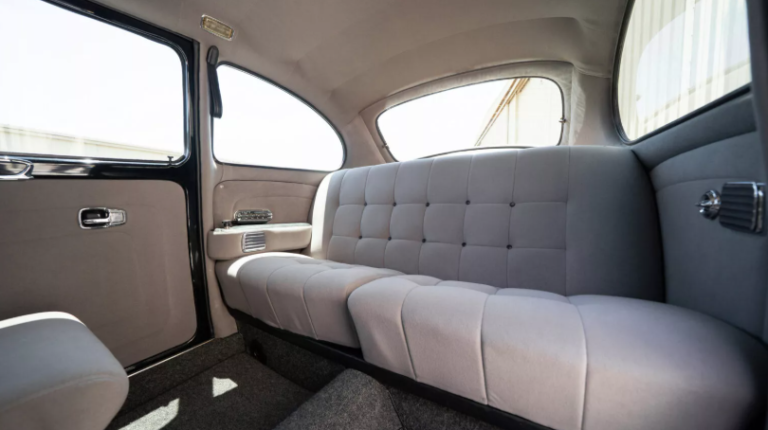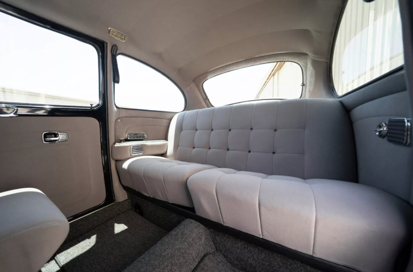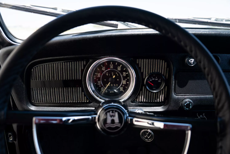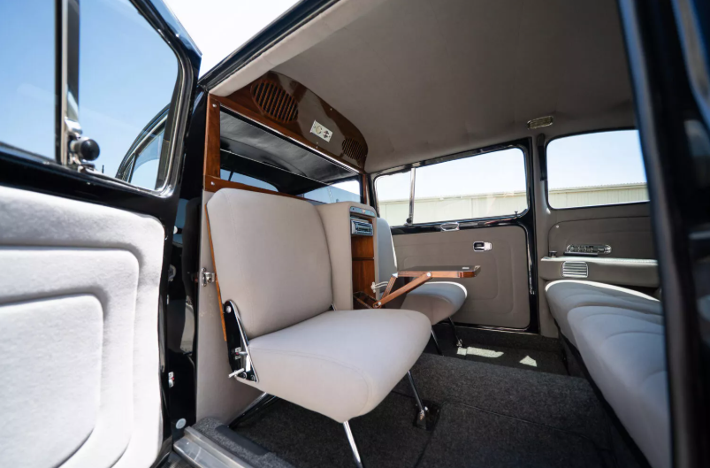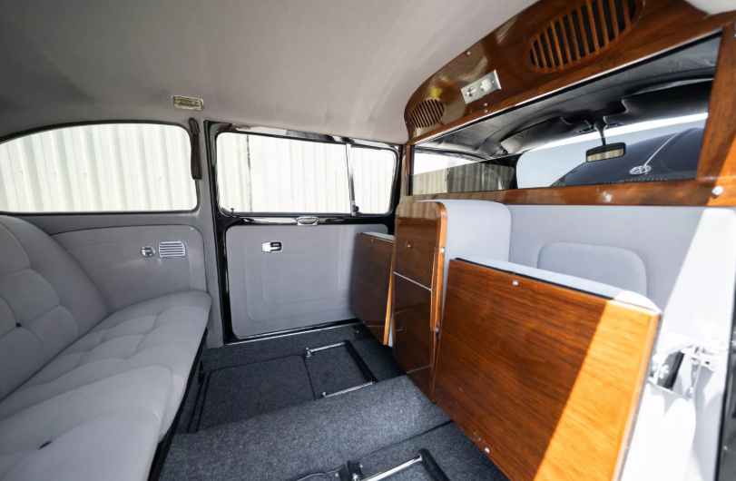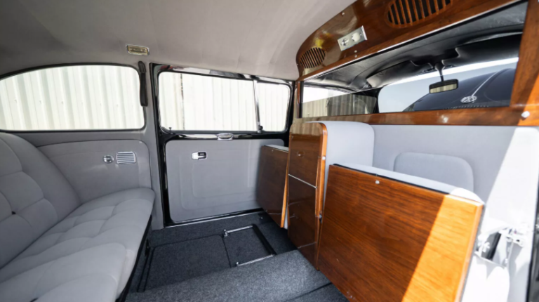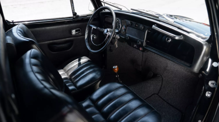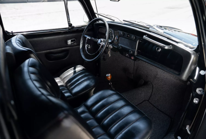 Зона водителя довольно простая с черными виниловыми сиденьями, минималистичной приборной панелью и оригинальным рулевым колесом. Пассажирская зона отделана светлой тканью, использованы вставки из натурального красного дерева.