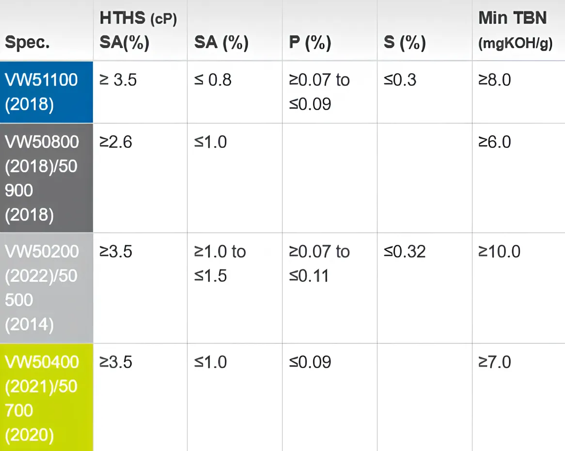 У зведеній таблиці (див. нижче у статті) чітко видно, що VW 504/507 тримає високий HTHS (≥3,5) і жорсткі обмеження за SA / P / S, забезпечуючи одночасно захист від зношування та довговічність систем післяобробки вихлопних газів.