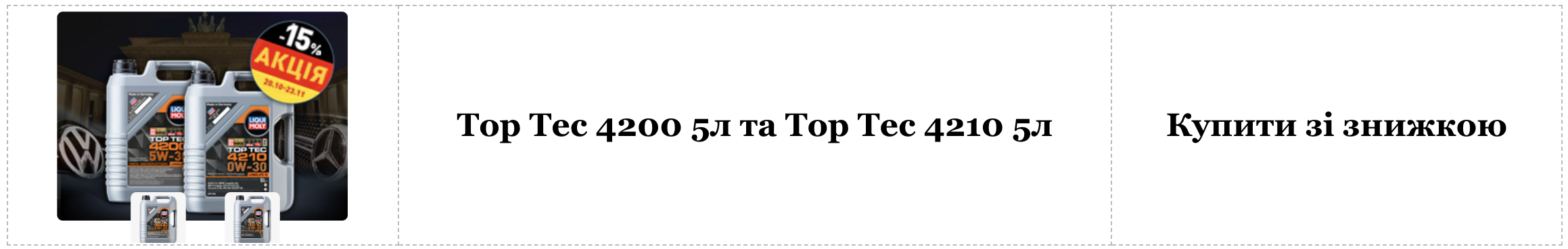 З 20 жовтня по 23 листопада 2025 року в офіційних точках продажу LIQUI MOLY в Україні діє акція «Das ist fantastisch для вашого авто» зі знижкою 15% на Top Tec 4200 SAE 5W-30 та 4210 SAE 0W-30 в 5-ти літрових каністрах. Якщо ви використовуєте VW 504/507 саме час оновити оливу на вигідних умовах.