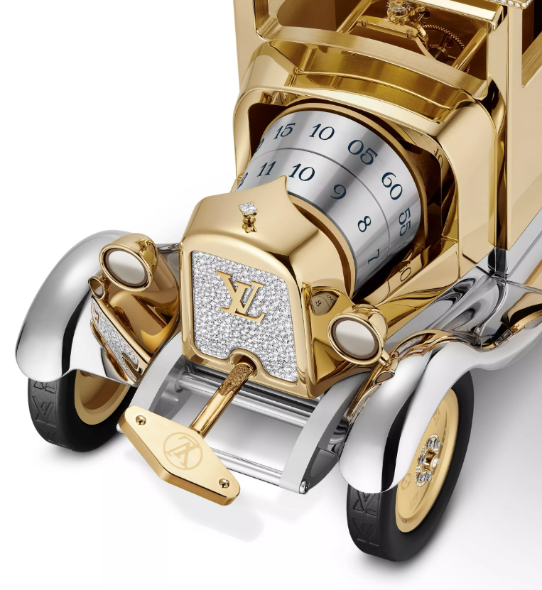 Корпус лимитированных часов изготовлен из позолоченного металла, инкрустированного вручную 1695 бриллиантами весом 41,44 карата. Драгоценные камни покрывают решетку радиатора, фары и кромки крыши, а задние фонари заменяют красные сапфиры. Центральным элементом является бриллиант LV Monogram весом 0,51 карата, расположенный на решетке радиатора. Под капотом автомобиля установлены два вращающихся цилиндра, которые показывают время.