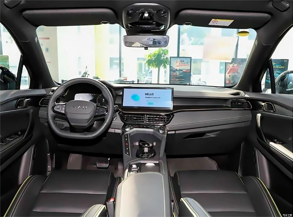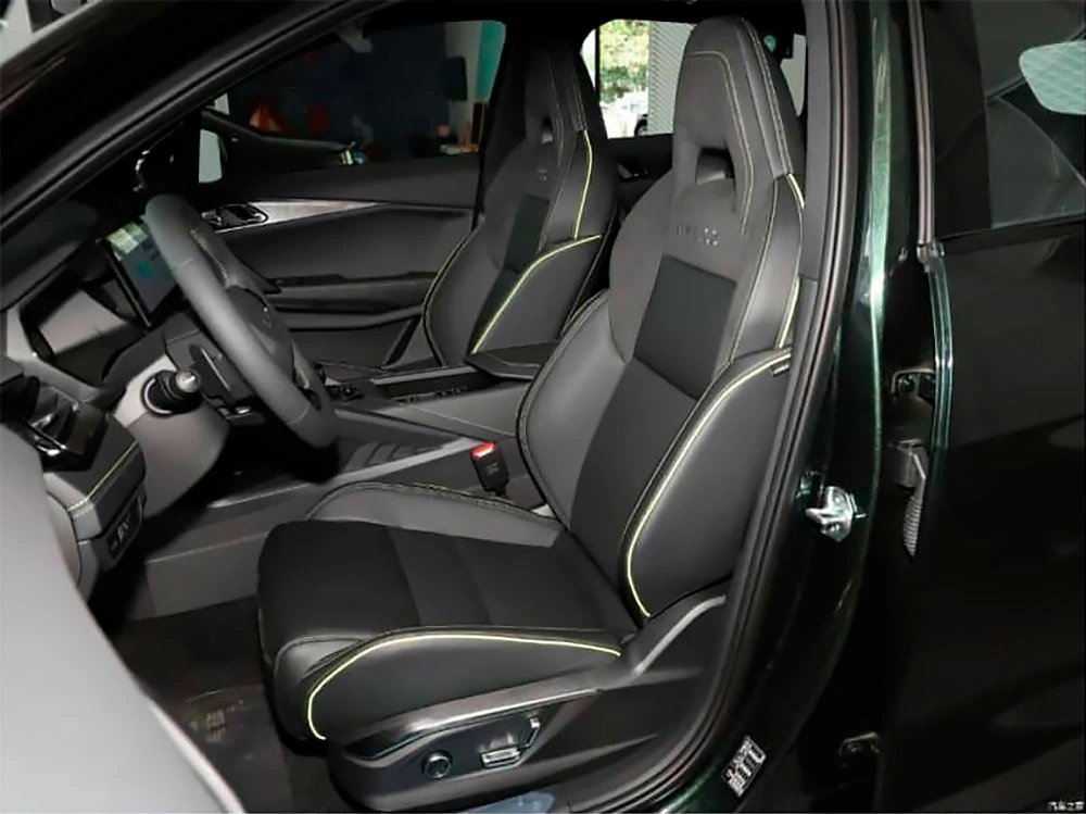 В салоне — трехспицевое рулевое колесо с усеченным ободом, цифровая панель приборов и «плавающий» 12,3-дюймовый центральный экран с поддержкой сервисов WeChat и TikTok. Спортивные сиденья украшены желтой декоративной строчкой. На месте традиционного рычага переключения коробки передач — небольшой джойстик.
