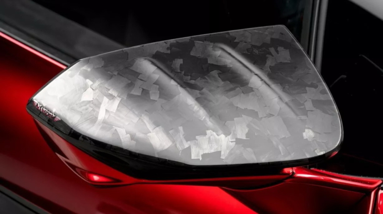 Большая часть кузова выполнена либо из кованого карбона, либо из глянцево-черного, но ярко-красный цвет украшает передние боковые панели и части дверей, а также полосы вокруг крышки двигателя. Среди других значительных изменений кузова — новые боковые воздухозаборники и юбки.