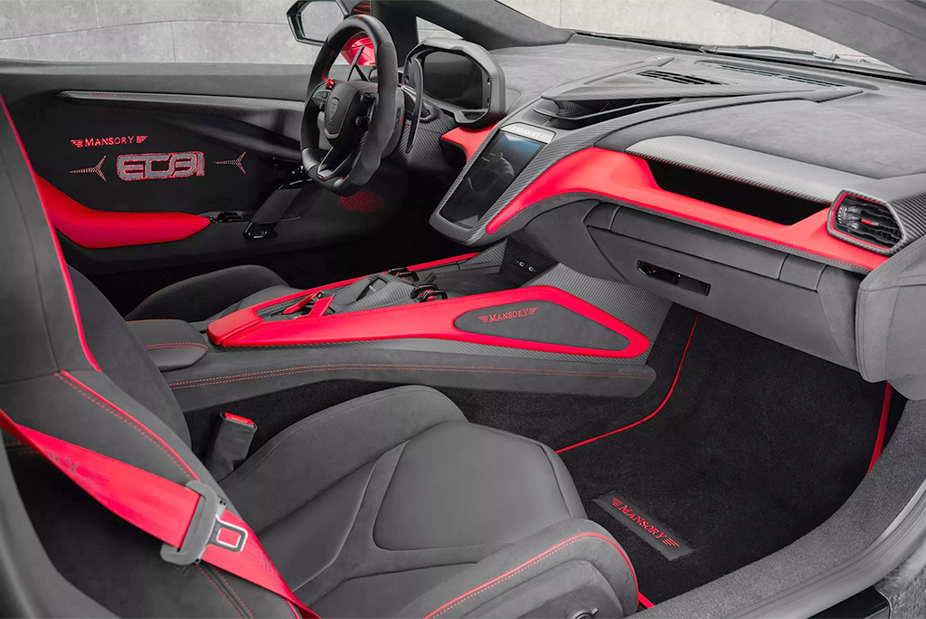 Уникальные штрихи не ограничиваются экстерьером. Внутри можно увидеть ярко-красную кожу, в том числе на приборной панели и трансмиссионном туннеле. Логотип Ocon также появился на дверных панелях и потолке. Кнопка запуска/остановки двигателя также перенесена на потолок. Довершают изменения красные ремни безопасности.