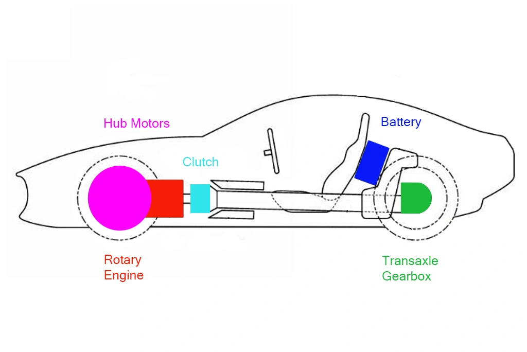 Еще одним перспективным проектом является двухместный спорткар с передним расположением роторного двигателя, задним приводом и установленной в блоке с задним дифференциалом коробкой передач. Такая компоновка позволит обеспечить идеальное (50/50) распределение массы между осями. Силовой агрегат спорткара также включает в себя передние мотор-колеса, получающие энергию от аккумуляторной батареи, расположенной за сиденьями. Кроме того, в данном случае роторный ДВС имеет механическую связь с колесами и может выступать в качестве единственного двигателя. Однако, для того, чтобы реализовать эту концепцию в полной мере необходимо добиться ощутимых успехов в создании углеродно-нейтрального топлива.