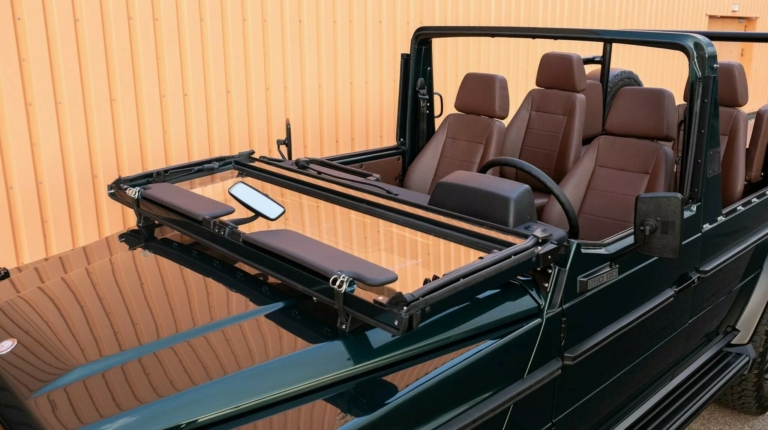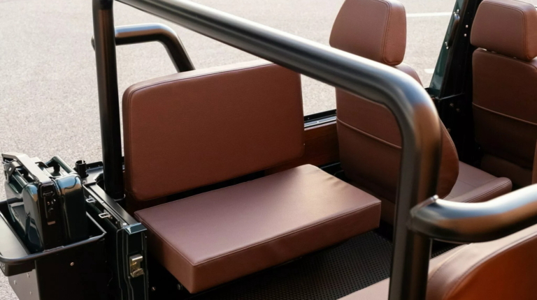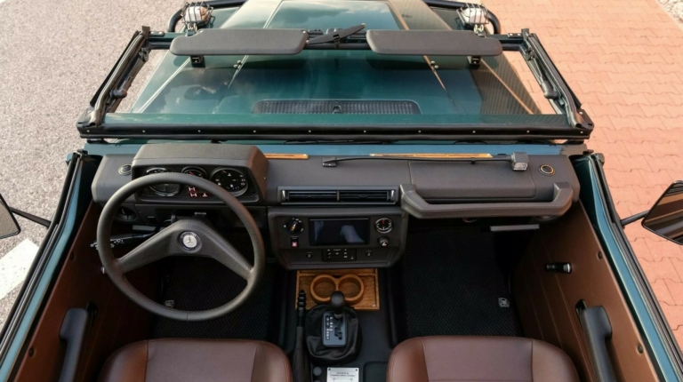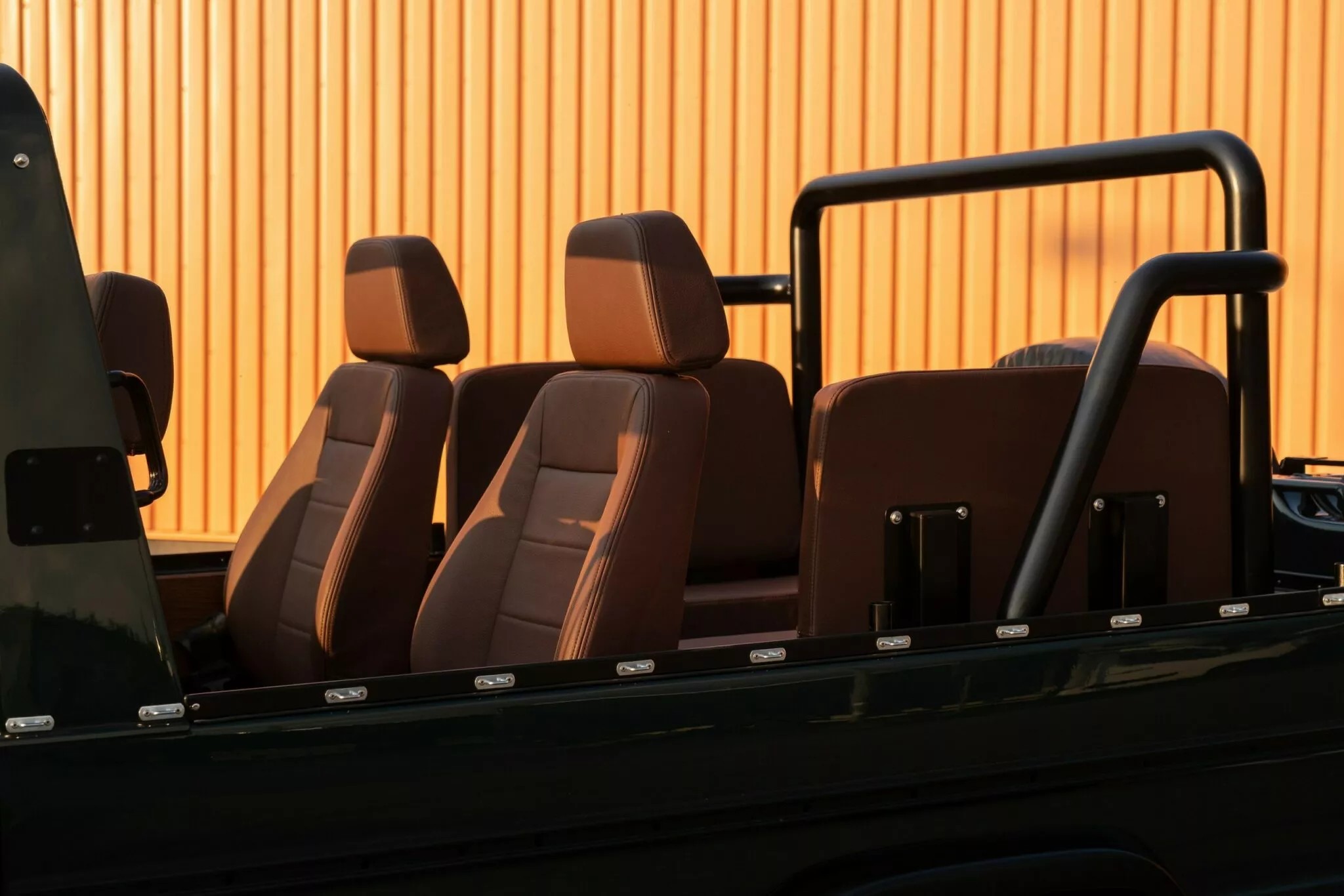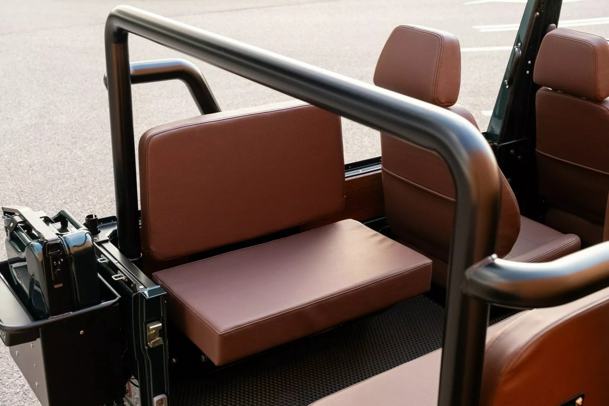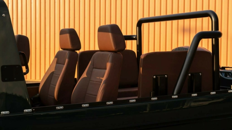 В салоне установлены четыре индивидуальных кресла с коричневой кожаной обивкой, а также два откидных сидения попроще. От непогоды путешественников защищает тканевый верх с боковыми целлулоидными окнами, которые можно легко свернуть в трубочку, чтобы расширить обзор по сторонам.