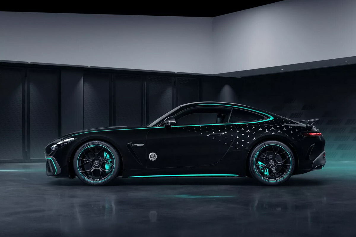 Кузов окрашен в глубокий черный цвет Obsidian Black, который дополнили пакетом AMG Nite, украсили фирменными “звездами”. Яркая “неоновая” детализация в корпоративном аквамариновом цвете Petronas подчеркивает силуэт боковых окон, пороги, 21-дюймовые колесные диски, воздухозаборники на переднем бампере, а также на огромных суппортах карбоновой тормозной системы.