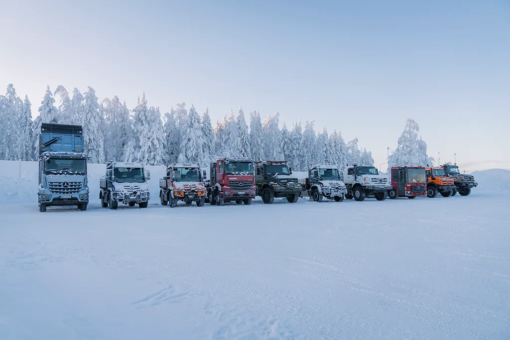 В течение нескольких недель специалисты Mеrcedes-Benz Special Trucks в условиях сверхнизких температур (-20С) проверяли тяговые свойства и устойчивость движения на обледенелых, заснеженных дорогах, уделяя особое внимание работе системы стабилизации ESP. Тестирование проводилось в том числе и с загрузкой автомобилей.