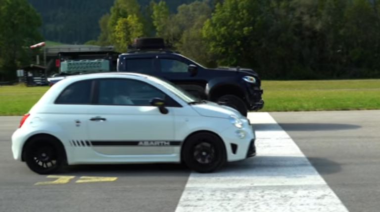 Модели не только отличаются габаритами. У них абсолютно разные характеристики и мощности. В заезде участвовала версия пикапа с индексом X350d. Она оснащена 3,0-литровым дизельным двигателем, который выдает 320 л.с. мощности и 730 Нм крутящего момента. Это на 65 л.с. и 180 Нм больше, чем у стандартного варианта. Соперником этого пикапа стал компактный Abarth 595 Competizione в заводской комплектации. Под его капотом установлен 1,4-литровый турбодвигатель на 180 л.с. и 250 Нм.