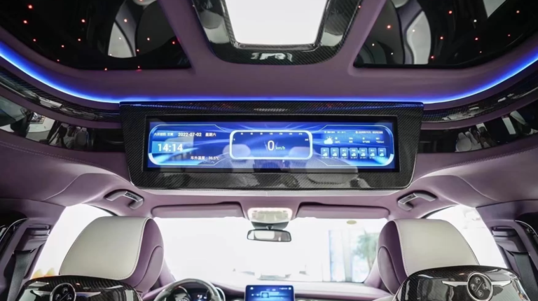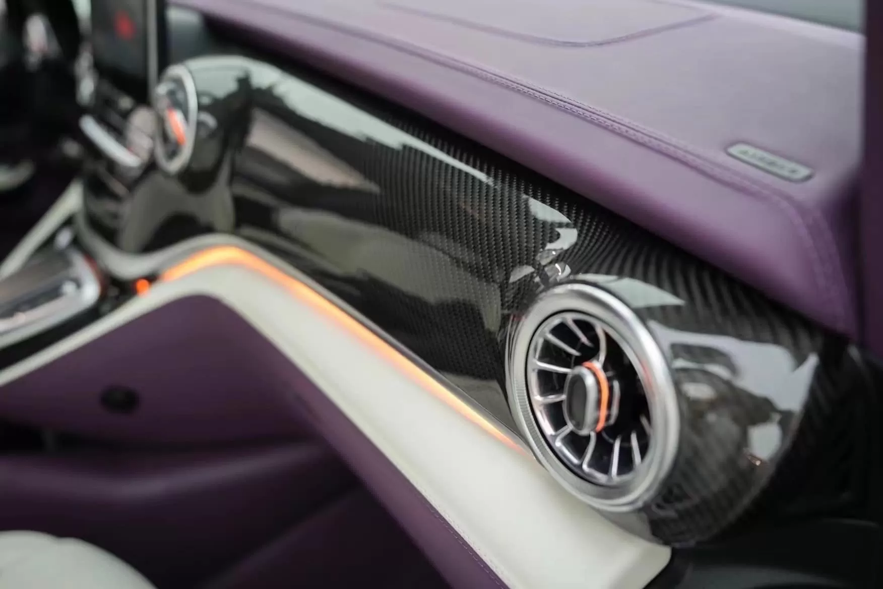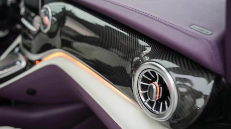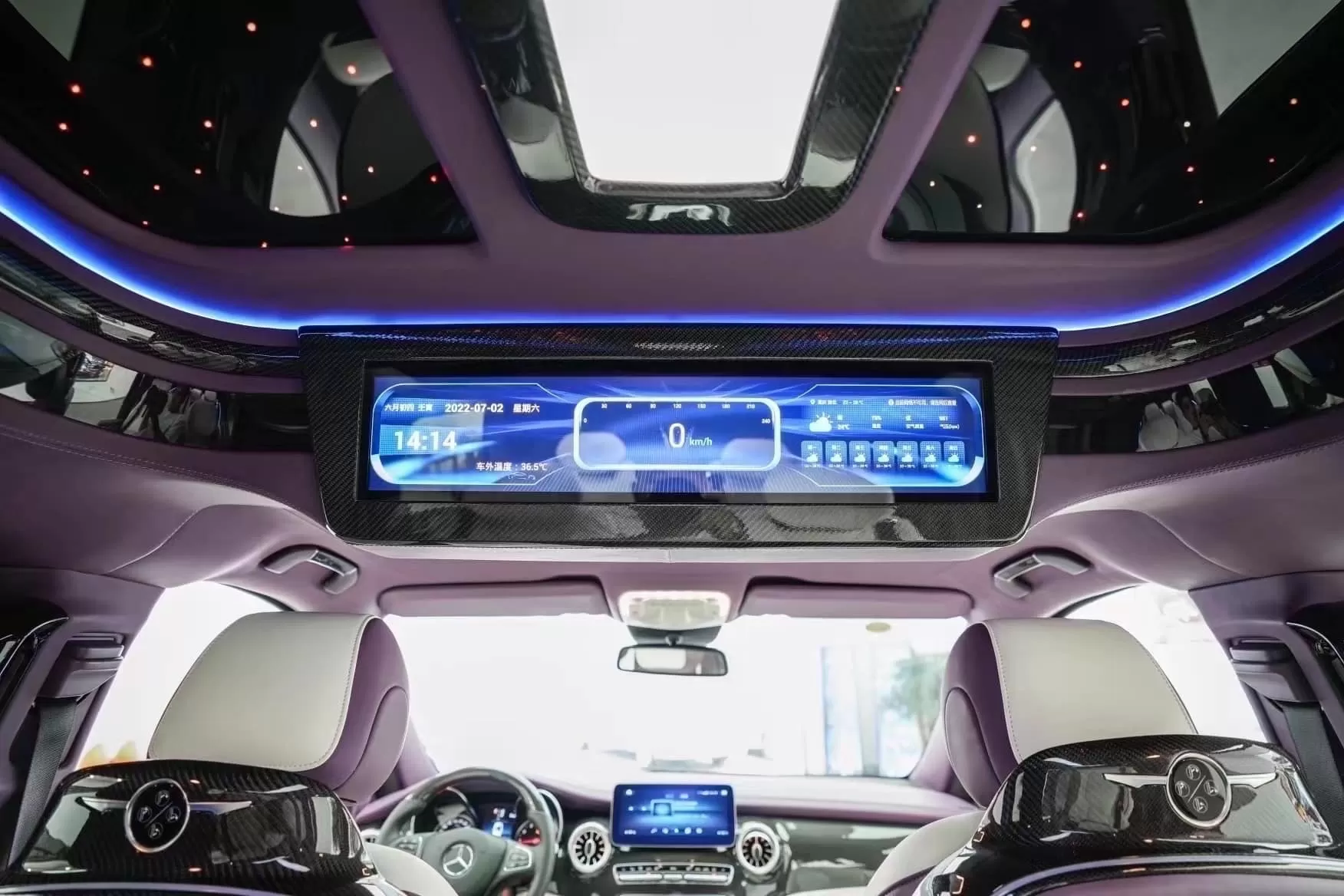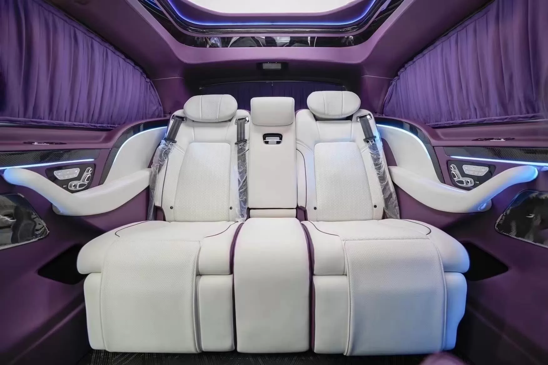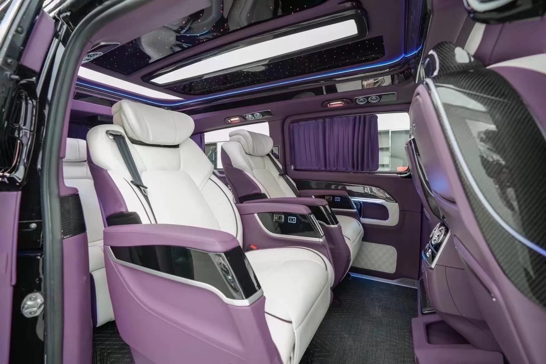 В отделке интерьера использована натуральная кожа белого и фиолетового цветов. За атмосферу в салоне отвечает скрытая светодиодная подсветка, способная изменять цвета, и звездное небо на потолке, как в лимузинах Rolls-Royce.