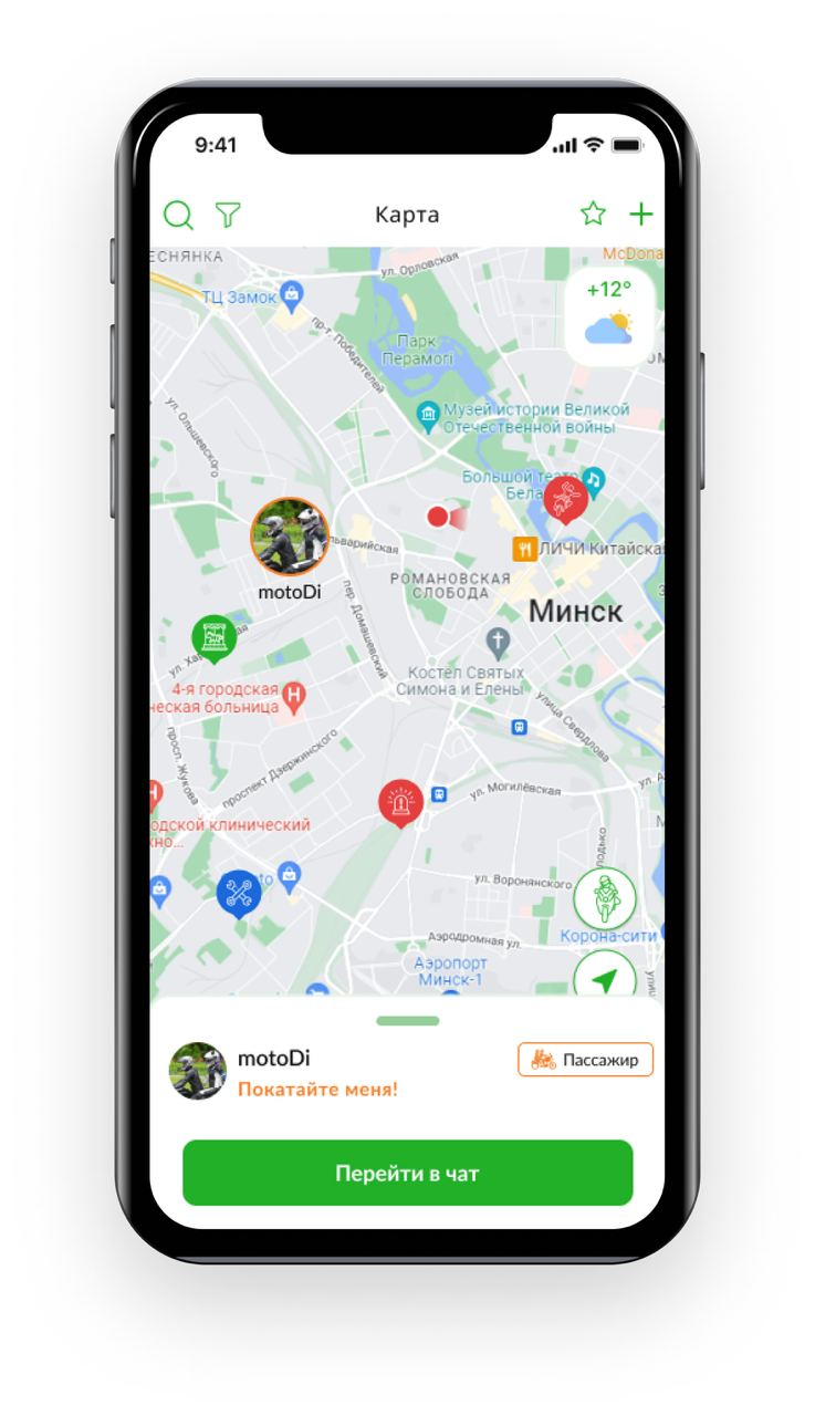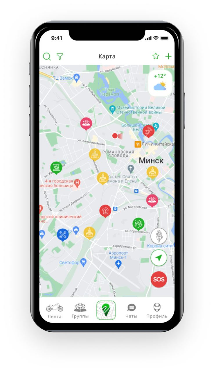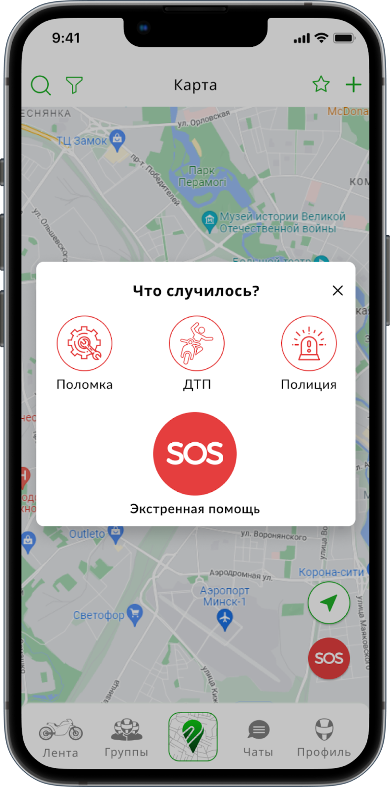 При клике на СОС автоматически определяется локация, появляется точка на карте + чат и рассылаются пуш-уведомления мотоциклистам в определенном радиусе. Конечно, если авария серьезная, то человек самостоятельно не сможет нажать на кнопку, но любой человек с приложением может выставить точку на карте и указать, что случилось. В целом это будет полезно в случае поломок для вызова эвакуатора или механика.