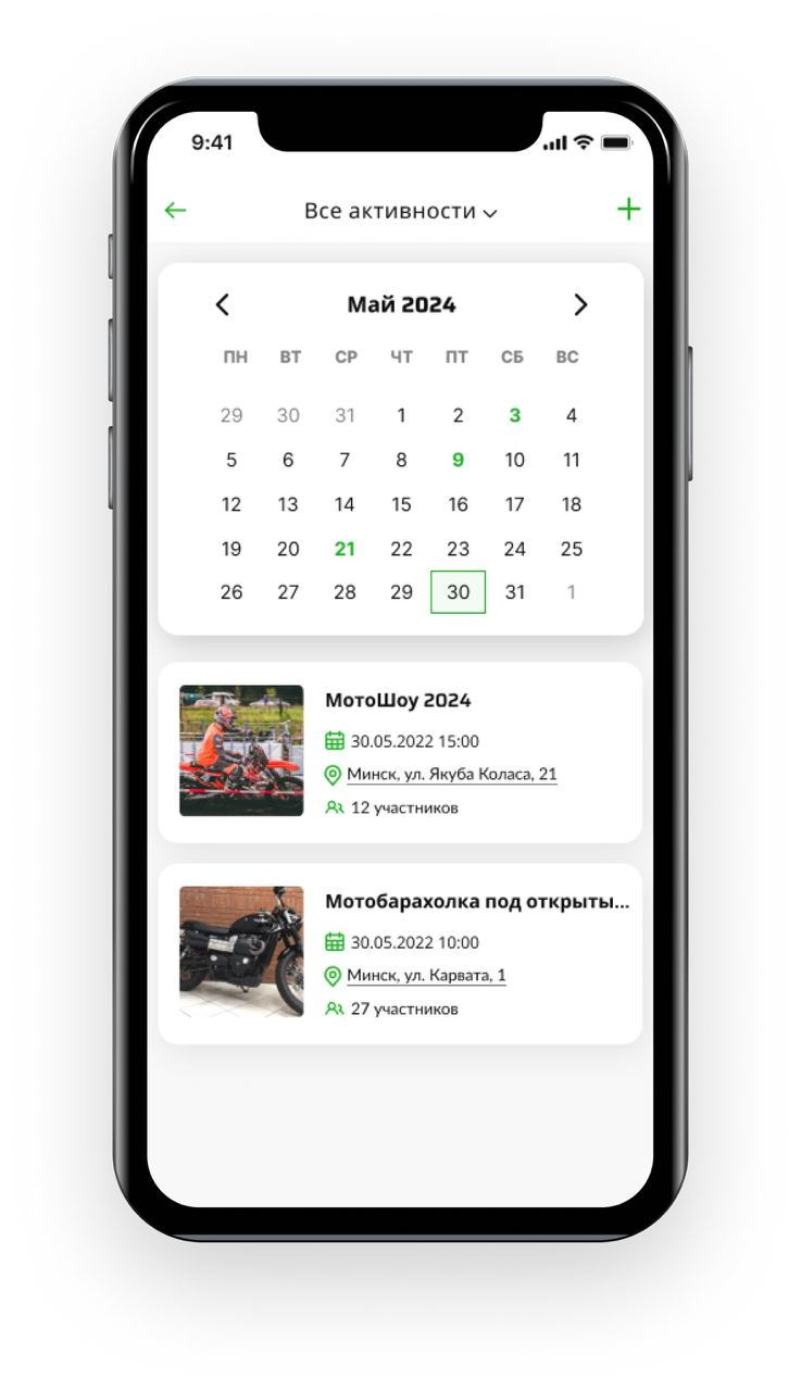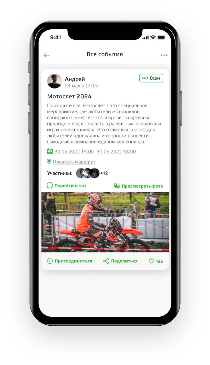 Также в приложении есть стандартные функции социальных сетей Чаты, Группы, Новости, События и Календарь. В календаре можно отслеживать все мотофестивали в стране и даже мире.