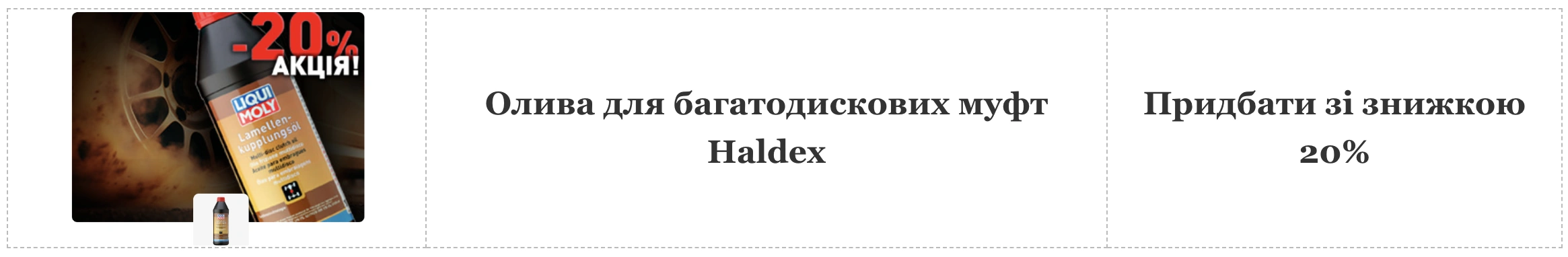 З 17.03.2025 по 20.04.2025 по всій Україні, у всіх офіційних точках продажу LIQUI MOLY, проходить акція на оливу для муфт Haldex Lamellenkupplungsol – знижка 20%. Це чудова нагода придбати високоякісну оливу за вигідною ціною, забезпечивши бездоганну роботу повного приводу вашого авто.