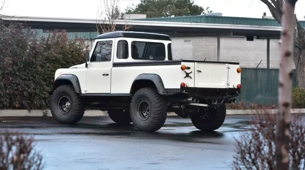 В листинге указано, что построили кастомный пикап специалисты компании 3R Automotive. За основу взяли двухдверный внедорожник Land Rover 110. Ему урезали кузов, получив вместительную грузовую платформу, установили вентилируемый капот, новые бамперы, массивные расширители колесных арок и 15-дюймовые диски, обутые в шины Goodyear Wrangler MT/R.