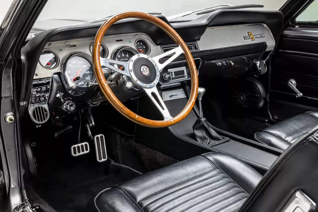 Ford окрашен в насыщенный серый “металлик”, который контрастирует с серебристыми полосами на кузове. Как и подобает настоящей “Eleanor”, передняя панель включает в себя более агрессивный бампер и решетку с дополнительными фарами. На машине установлен комплект 18-дюймовых колес American Racing Shelby Cobra, обутых в шины Hankook Ventus S1 Noble2 размерностью 275/35.