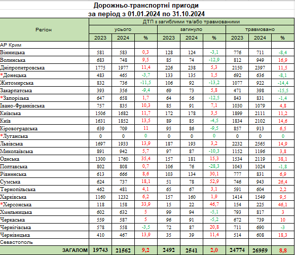 Количество травмированных, как и погибших, в авариях на дорогах Украины также выросло. С начала года показатель увеличился на 8,8% до 26 959 человек. Худшие показатели у Львовской (2565 человек), Одесской (2119 человек), Днепропетровской (2397 человек) и Киевской (2111 человек) областей. Но в ряде областей наблюдалась положительная динамика. Лучшие показатели были у Закарпатской и Житомирской областей, где с начала года травматизм в ДТП сократился на 15,5 и 14,4% соответственно.