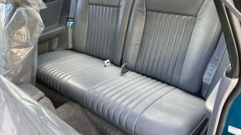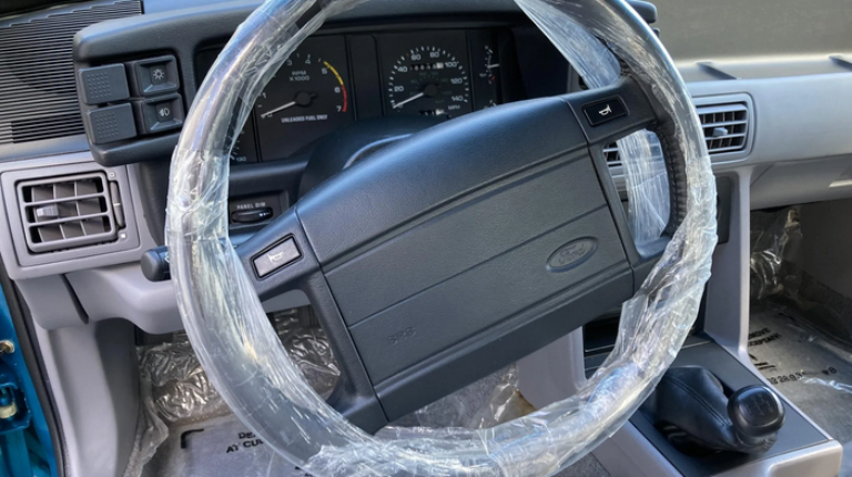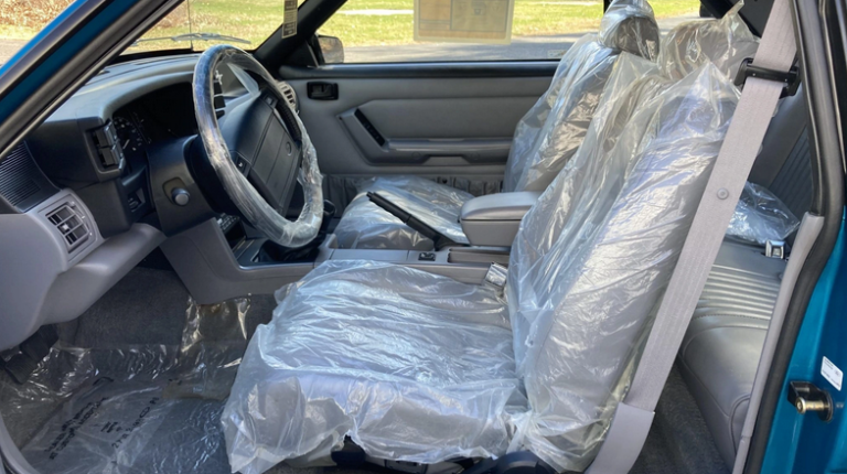 Салон Mustang SVT Cobra отделан серой кожей и находится в идеальном состоянии. Сиденья до сих пор покрыты заводской пленкой. В его оснащение вошли кресла с электроприводом, кондиционер, аудиосистема с кассетным плеером и подогрев заднего стекла.