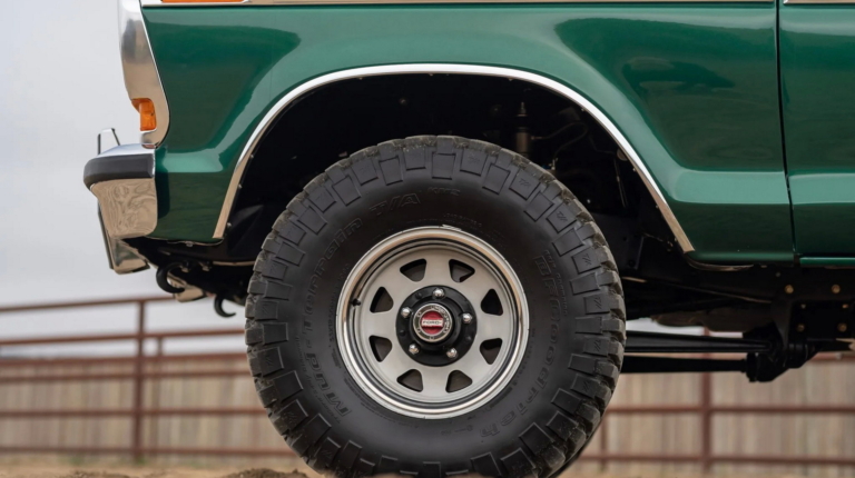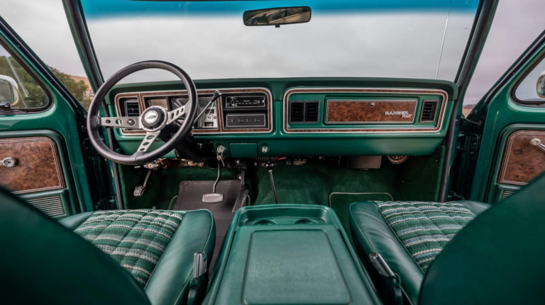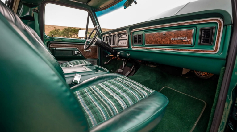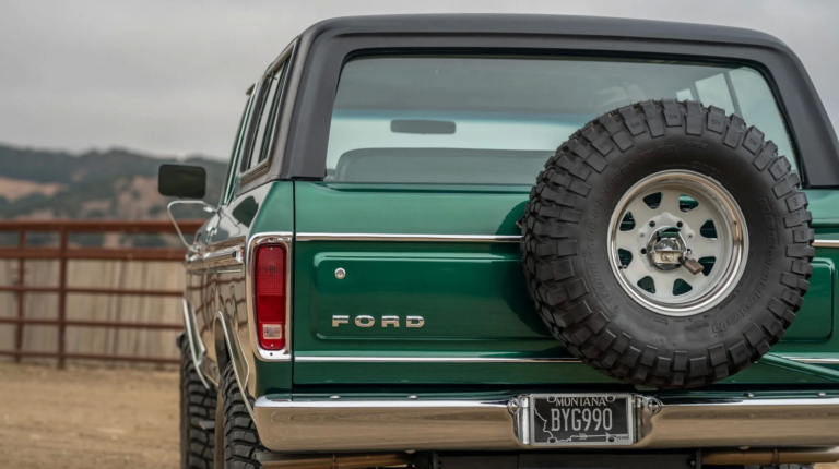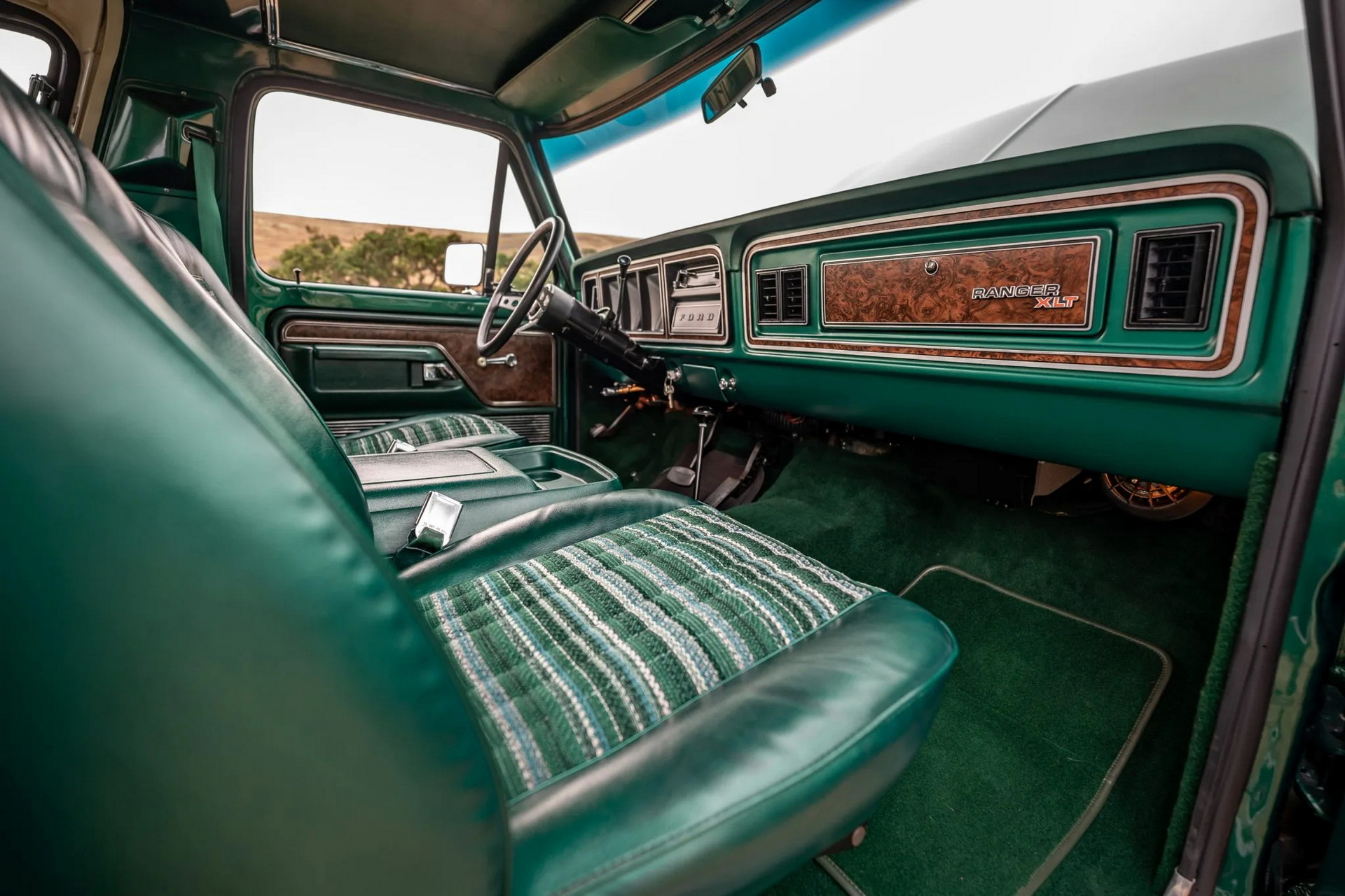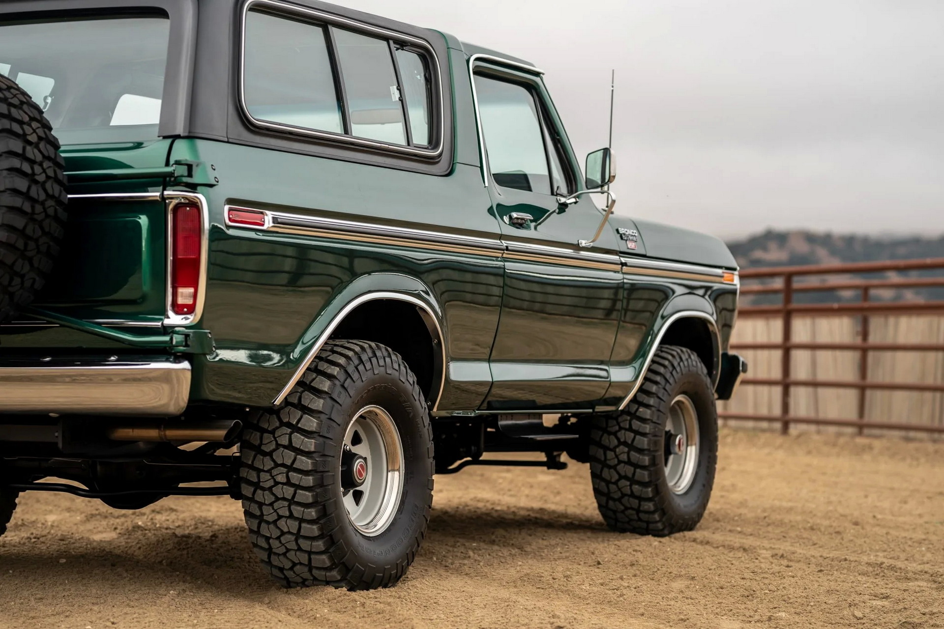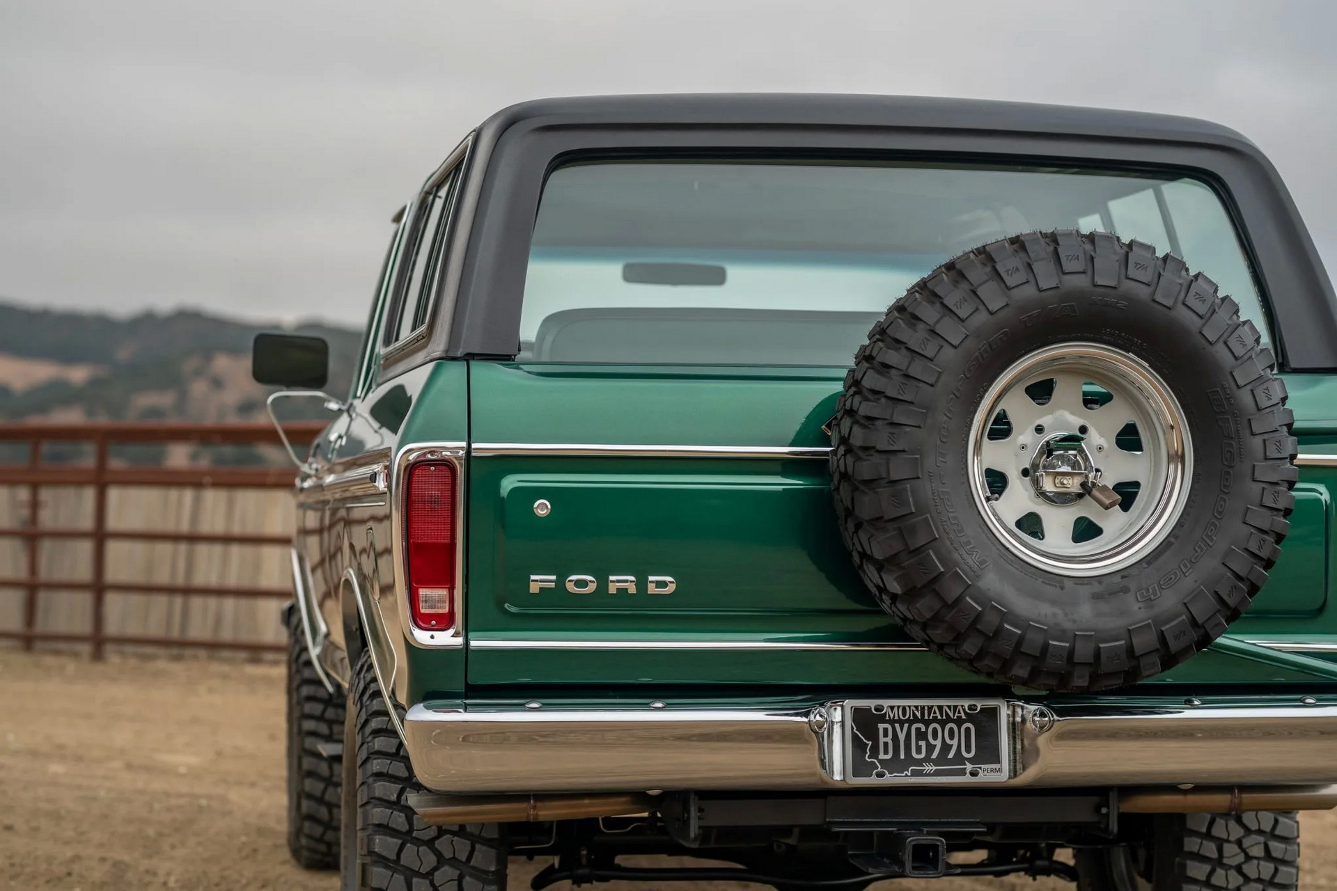 Bronco Ranger XLT 1979 года выпуска находится в идеальном состоянии. А все потому, что он был полностью отреставрирован в 2020 году. Его кузов окрашен в оттенок Dark Jade Metallic, который отлично сочетается с черной съемной крышей и аналогичного цвета 15-дюймовыми колесами, обутыми в шины BFGoodrich Mud-Terrain T/A. На корме на откидном держателе закреплена соответствующая запаска.