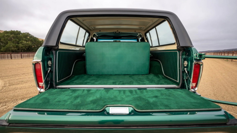 В салоне установлены ковшеобразные сиденья, а вот втором ряду – небольшой диванчик. Отделка кабины выполнена зеленым винилом со вставками из фактурной ткани, которую дополняет отделка под дерево. На одометре зафиксирован пробег в 3200 миль (12 070 км). Именно столько успел накатать внедорожник после реставрации. Истинный пробег неизвестен.