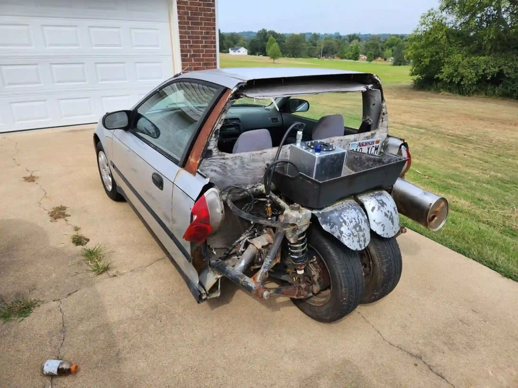 В США продают необычный Honda Civic 2000 года. У автомобиля нет задней части кузова до средней стойки дверей. На ее месте собранная из металлолома конструкция с двумя колесами по центру.