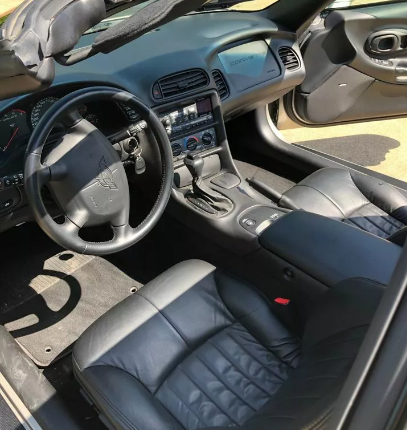 Салон Chevrolet Corvette C5 выглядит идеально. На черных кожаных сиденьях практически нет признаков износа, и это учитывая 21-летний возраст спорткара. Также идеальны рулевое колесо, передняя панель и центральная консоль.