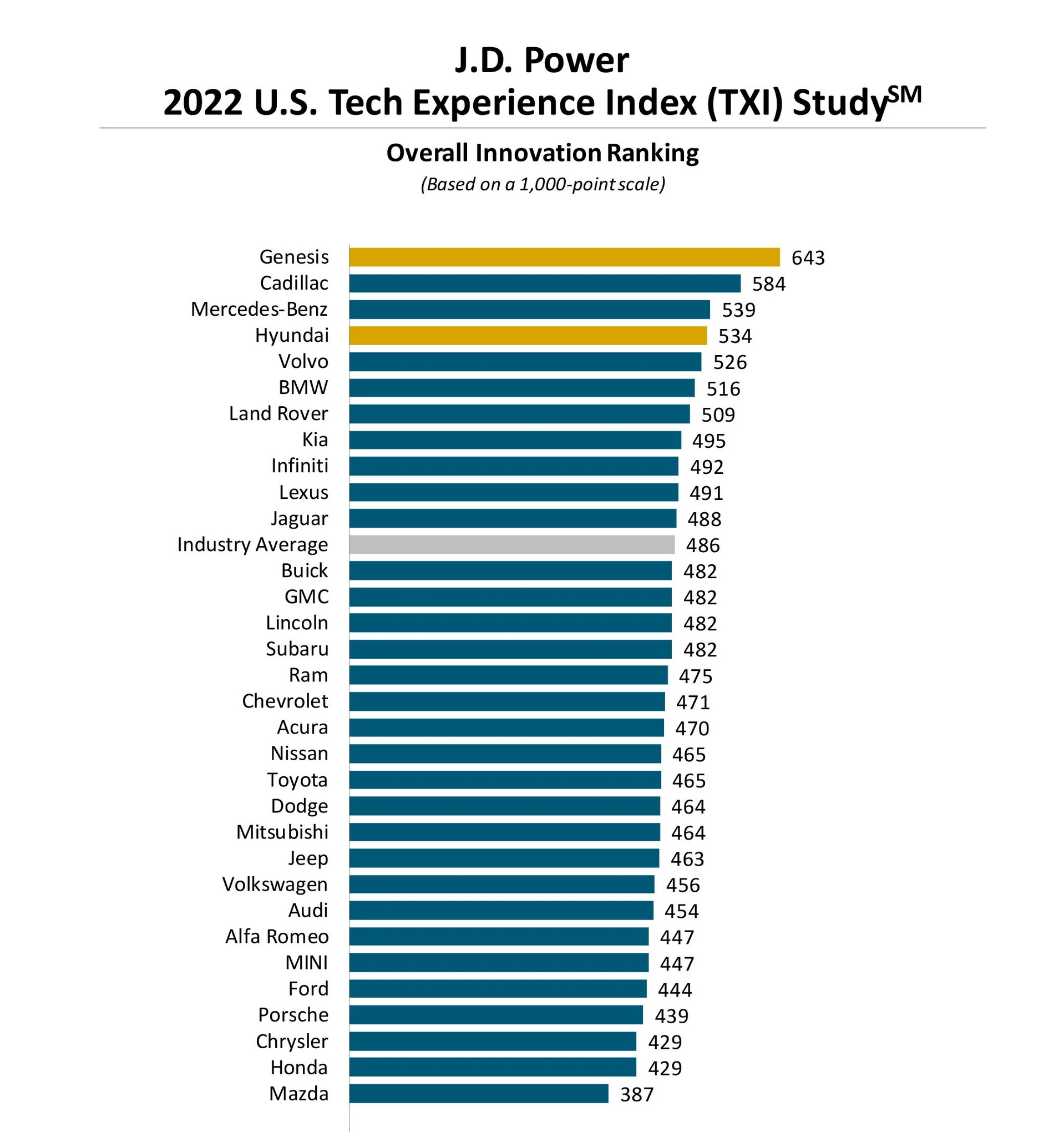 Лидером данного рейтинга стала компания Genesis, которая является премиальным брендом Hyundai Motor. Она набрала 643 балла. Второе место заняла марка Cadillac, входящая в состав концерна General Motor. На ее счету 584 балла. Третий результат у Mercedes-Benz – 539 баллов. Худший результат, по данным J.D. Power, в плане инновационности выпускаемых машин показали Honda и Mazda.