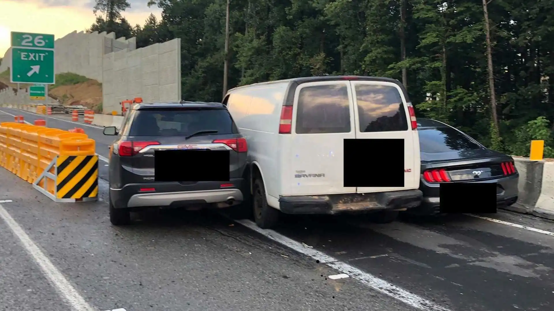 На одном из загородных шоссе штата Джорджия (США) не поделили дорогу стразу три автомобиля. Водители попытались одновременно проехать узкий участок и попросту застряли между бетонным заграждением и перегородкой. Минивэн GMC Savana оказался зажатым между GMC Acadia и Ford Mustang. Меньше всего пострадал кроссовер. На нем обнаружены незначительные царапины и несколько вмятин.
