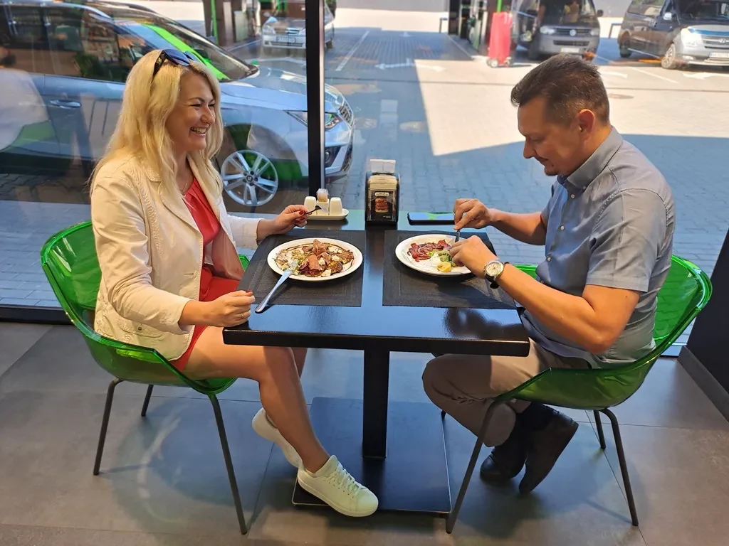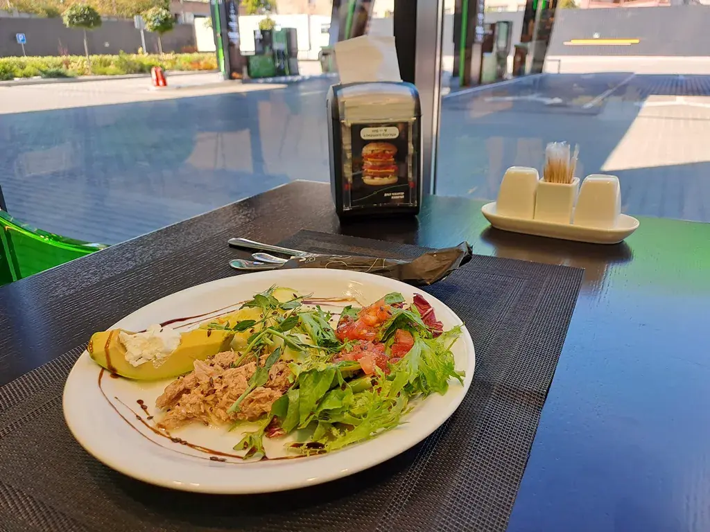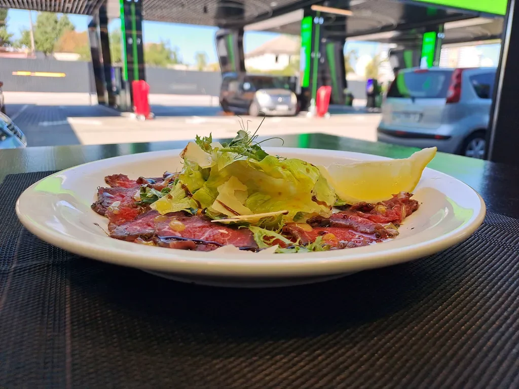 Страва аж ніяк не «придорожна», швидше авторська. Вирізка яловичини, найтонші, мало не прозорі слайси якої ми побачили на тарілці, маринована нейтральним соусом. По центру ніжний салат (справді ніжний!) і томати, на кожному «медальйоні» вкладено каперси. М’ясо полито цитрусовою заправкою з обов’язковим для карпачо пармезаном. Без перебільшення, готувати італійські делікатеси тут можуть, смак вишуканий, і було трохи дивно ласувати чимось подібним саме там, де заправляють автомобілі.