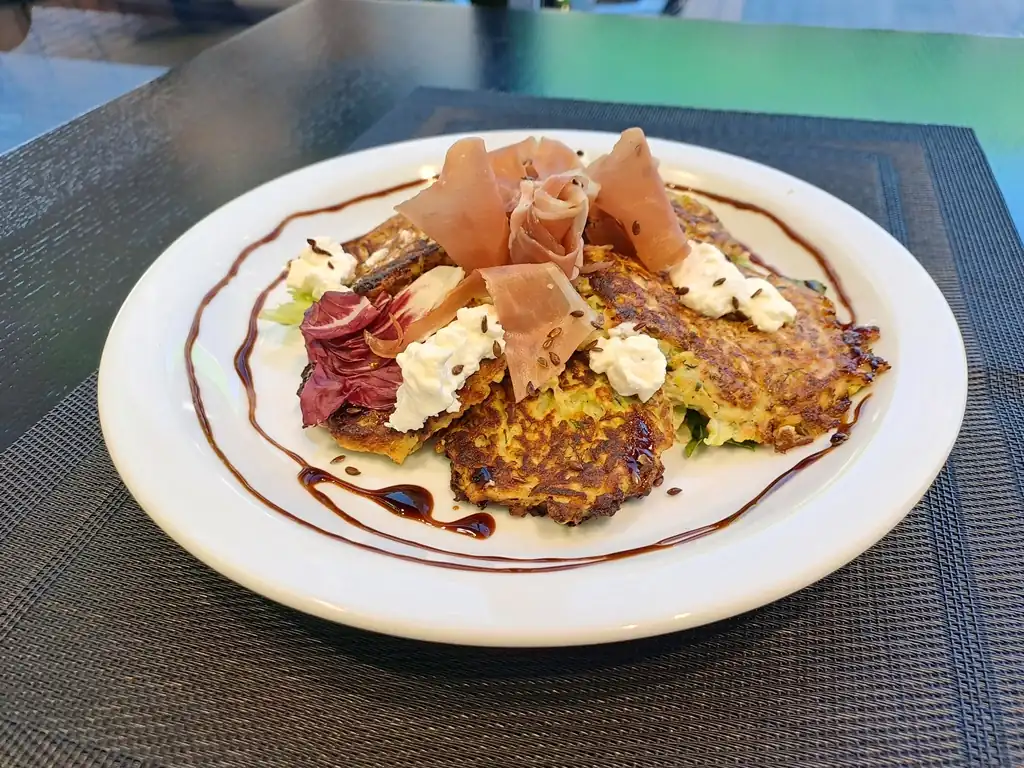 Ця позиція меню – явно з умовної категорії «по-домашньому», тому спочатку ми подумали, що це мають бути класичні деруни, але тут на нас чекали відразу дві новації. По-перше, кабачкові оладки - вони легші на смак і набагато ніжніші за традиційні картопляні. По-друге, їхній смак дуже ефектно відтіняється в’яленою свининою. Слайси прошуто, складені зверху, оформлені свіжим салатом і корисним для організму насінням льону. Бальзамічний соус і цитрусова заправка додають своїх відтінків смаку, а візуально довершують картину апетитні шматочки крем-сиру. Суттєво, що на тарілці розміщено аж шість оладків – тобто це не просто сучасно і красиво, цим можна наїстися.