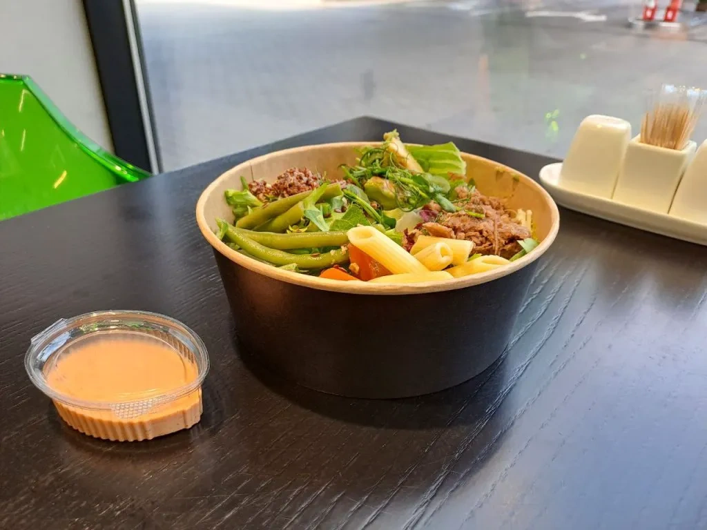 Наприклад, боул з яловичиною та кіноа – це тушкована яловичина, пір’я макарон пене, спаржева квасоля, морква і скибочка авокадо. Страва подається у загальній глибокій тарілці, звідки, власне, і походить назва. Є також інший варіант боулу – з тунцем замість яловичини та яйцем замість пене. Ми такого теж не куштували, але на вигляд – так само смачно. До речі, ці дві страви – для тих мандрівників, що рахують калорії, адже вони цілком підходять під категорію так званого окремого харчування.