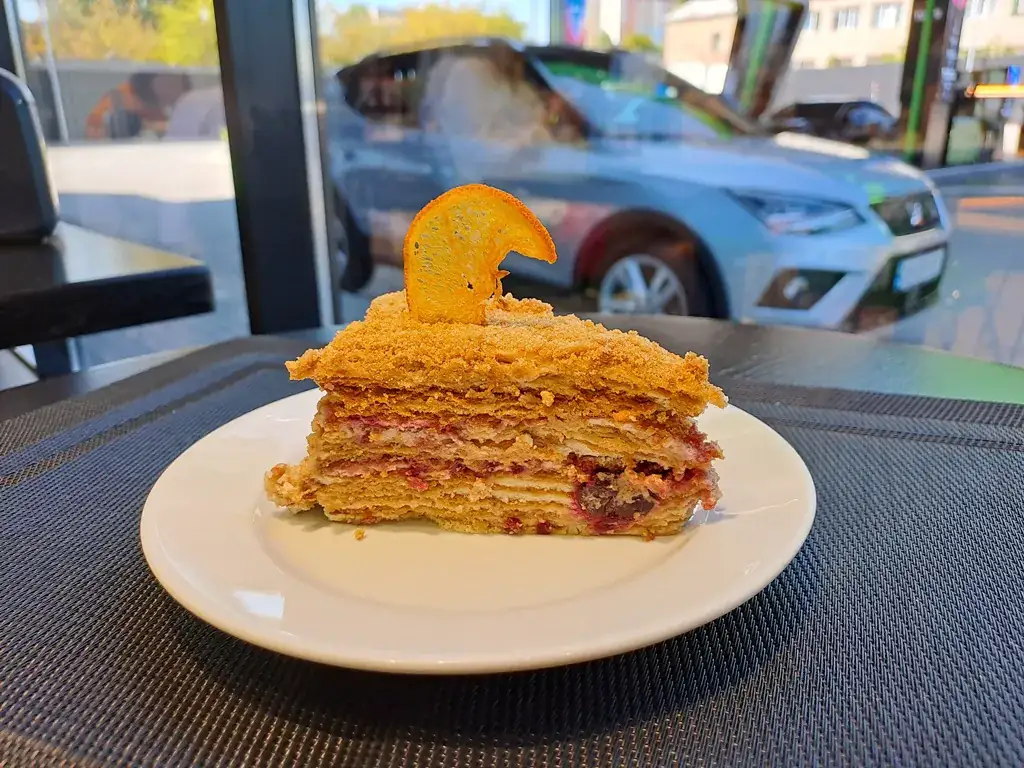 Традиційний торт-медовик не передбачає жодних інгредієнтів рослинного походження, крім хіба що лимонної цедри (ми двічі звірилися з кулінарними сайтами). Але кухарі VIVO café трошки похитнули кондитерські канони і додали до цього тортика трохи вишень. Вийшло незвично і смачно, екіпаж «Автоцентра» вирішив, що це буде нашим улюбленим десертом на UPG. Принаймні, протягом поточного року.
