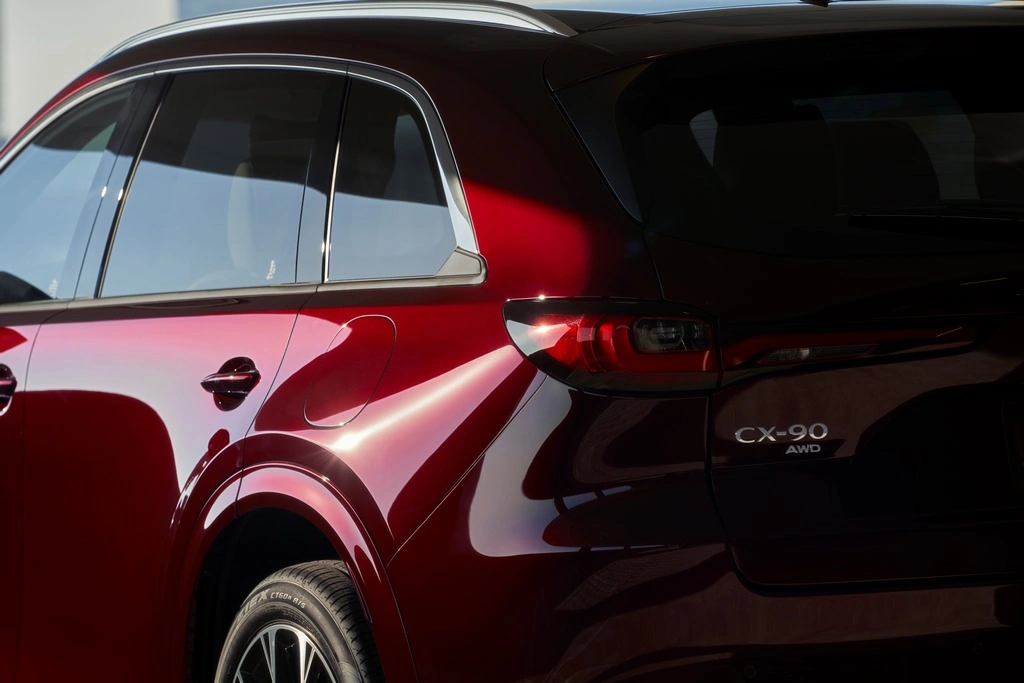 Візуальне сприйняття динамічного дизайну Mazda CX–90 наголошує кольорове забарвлення переднього та заднього бамперів із колісними арками у колір кузова у поєднанні із хромованим оздобленням бічних написів і віконних молдингів, додає відчуття найвищої якості. Декоративне хромоване оздоблення нижньої частини заднього бамперу акцентує на ширині кузова та додає вигляду стилістичної довершеності.