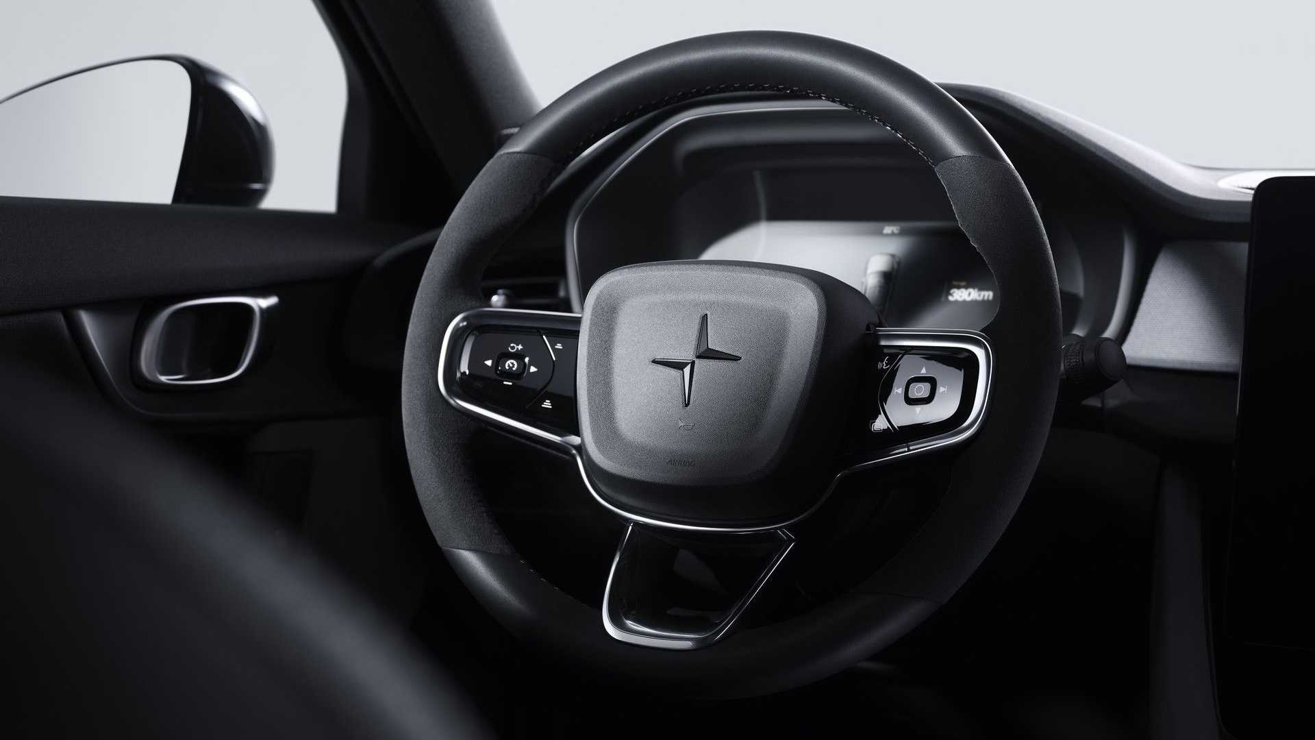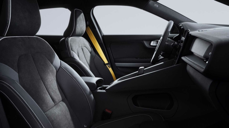 Салон Polestar 2 BST edition 230 отделан нубуком и алькантарой темно-серого и черного оттенков, которые отлично контрастируют с ярко-желтыми ремнями безопасности. Электромобиль стандартно поставляется с панорамной стеклянной крышей, премиальной аудиосистемой Harman Kardon, камерами кругового обзора, широким пакетом систем помощи водителю и ассистентов безопасности.