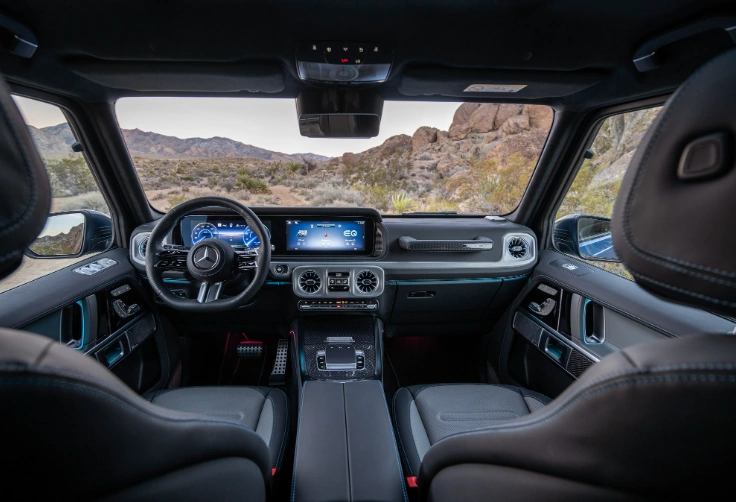 Салон Mercedes G580 with EQ Technology также повторяет топливную версию. В оснащение вошло два 12,3-дюймовых экрана, объединенные в один блок. Один из них предназначен для цифровой панели приборов, а второй – мультимедийной системы. В отделке кабины использованы кожа, алькантара и вставки из карбона. Есть широкий список систем помощи водителю и ассистентов безопасности, камеры кругового обзора, а еще навигация с дополненной реальностью.