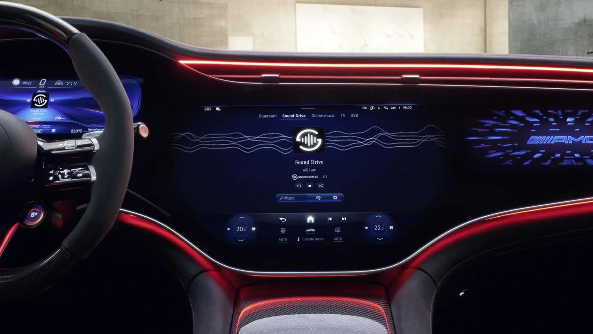 Еще одно новшество — Sound Drive. Как утверждается, это приложение позволит водителю «играть на своем автомобиле как на музыкальном инструменте». В реализации этой идеи принимал участие рэпер и музыкальный продюсер will.i.am. Мелодия будет зависеть от нажатия на педаль тормоза или газа, рекуперативного торможения и рулевого управления. Это могут быть как энергичные мелодии, так и более спокойные. Все зависит от манеры вождения водителя.