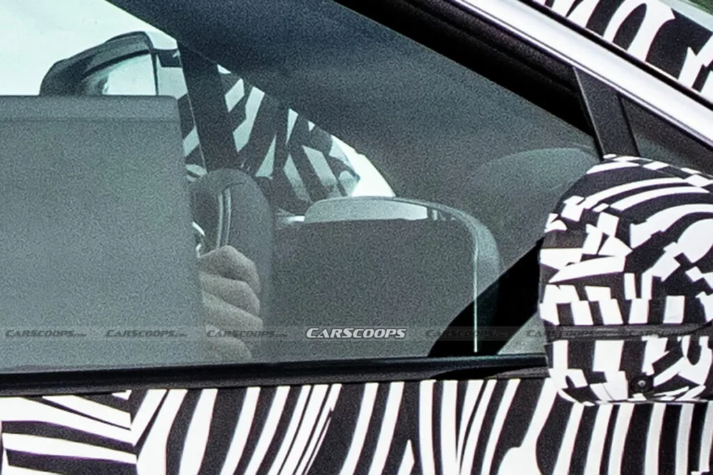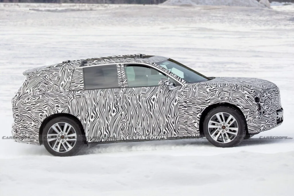 Задние боковые окна оклеены камуфляжем. Длинная колесная база, высокая крыша и расположение сидений второго ряда указывают на трехрядную компоновку салона. Мелькнувшая на фото цифровая кабина похожа на будущий электрический кроссовер Lyriq. Мы ожидаем 33-дюймовый изогнутый дисплей с разрешением 9K, как в обновленном Cadillac XT4 2024 года.