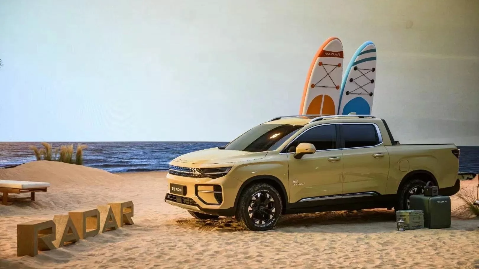 Судя по фото, габаритами RD6 сравнится с Mitsubishi L200. Оформлением передней панели он напоминает Range Rover, но в целом ничего выдающегося в экстерьере китайского пикапа нет. Предположительно, клиентам предложат дополнительное оборудование. В частности, в пользу этой версии говорят надписи «Radar» на изображенных на официальных фото досках для серфинга, автомобильный холодильник и радио.