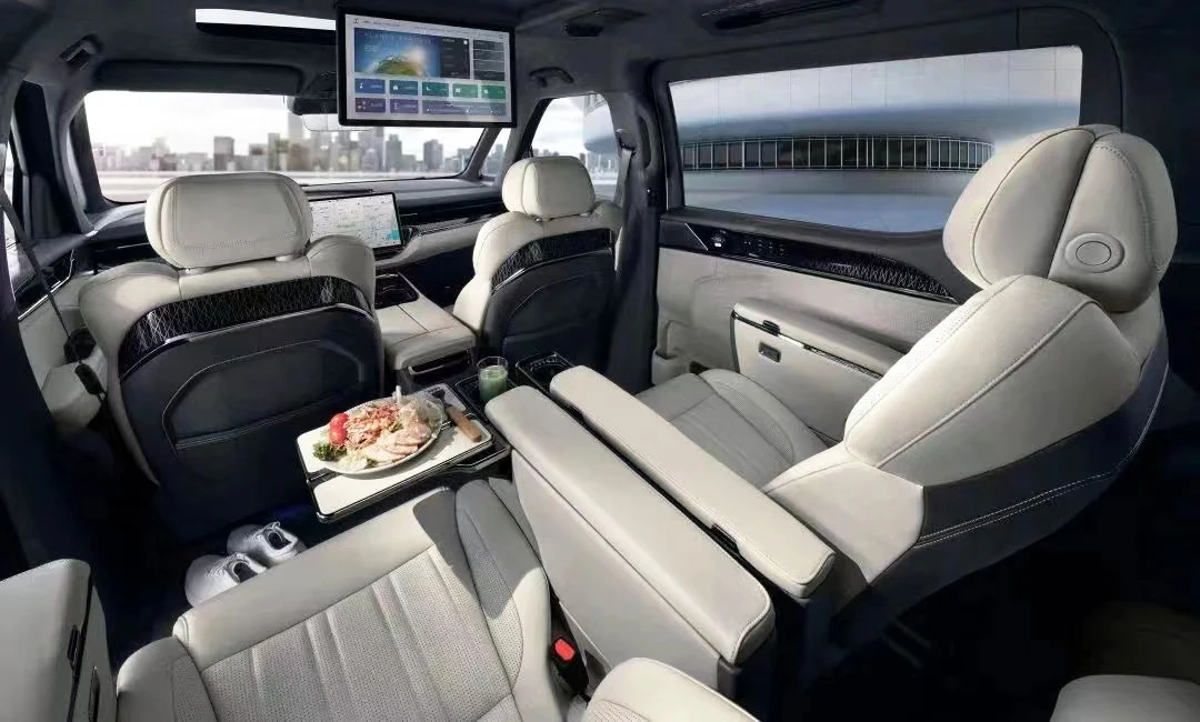 Салон — шестиместный с двумя отдельными капитанскими сиденьями во втором ряду. Они оборудованы массажем, вентиляцией, выдвижными подставками для ног и динамиками (встроены в подголовники). На передней панели — два дисплея, отдельный 15,6-дюймовый экран для развлечения задних пассажиров прикреплен к потолку. Также небольшие дисплеи встроены в сдвижные задние двери. На них вынесено управление климат-контролем. Окна и солнцезащитные шторки управляются сенсорными кнопками на дверях. Есть даже небольшие раскладные столики. В отделке интерьера использованы замша и кожа Nappa.